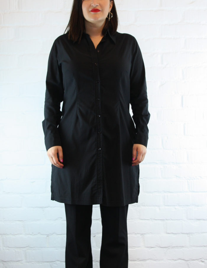 En svart tunika med vitt mönster. Den har halvlång ärm och dold dragkedja i sidan. Märke: Symbology Storlek: L Passform: Normal Modellen är 174 cm lång, bär normalt S/M och har på bilden S.
