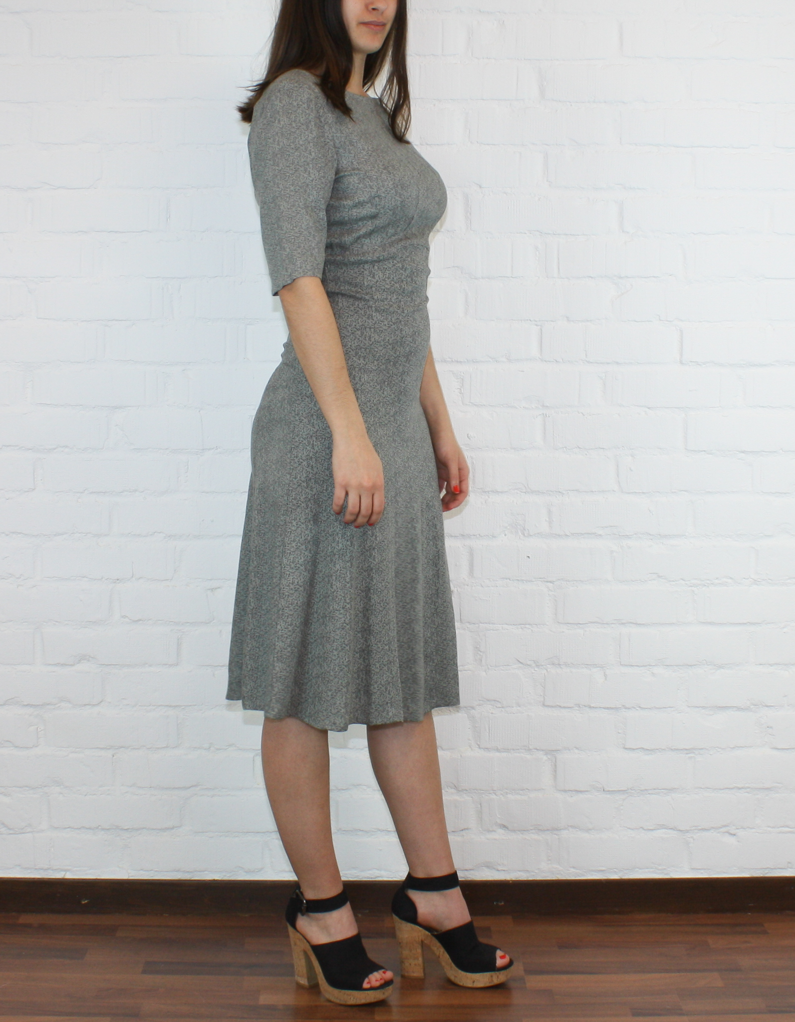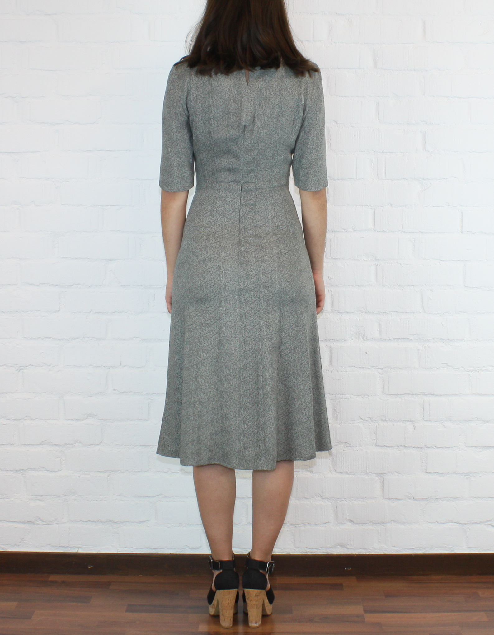En klänning i italienskt ull och viskos. Överdelen ger en bluseffekt över bröst och rygg och ärmarna är i armbågslängd. Den är lite kortare framtill än bak. Dold dragkedja baktill och en liten pärlemorsknapp i nacken.