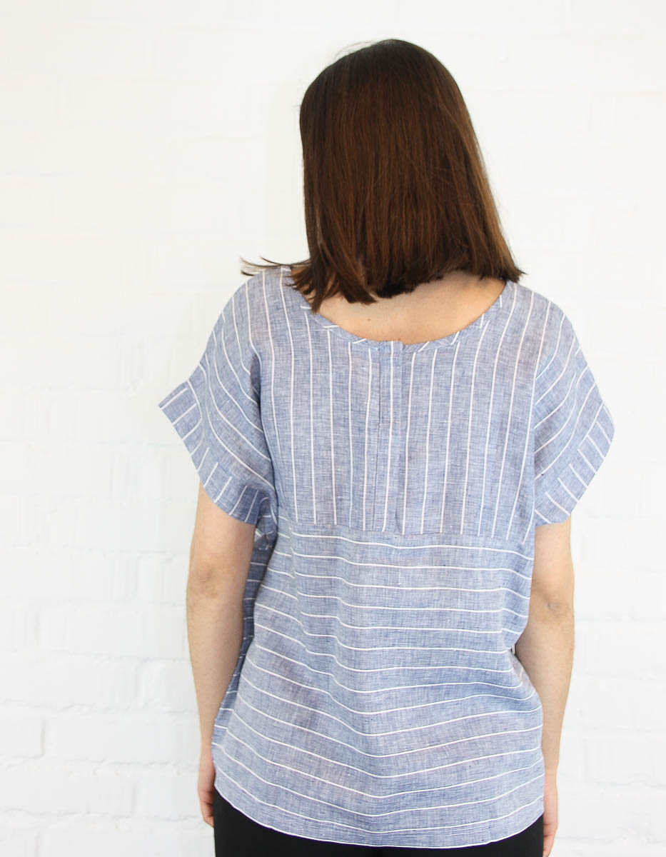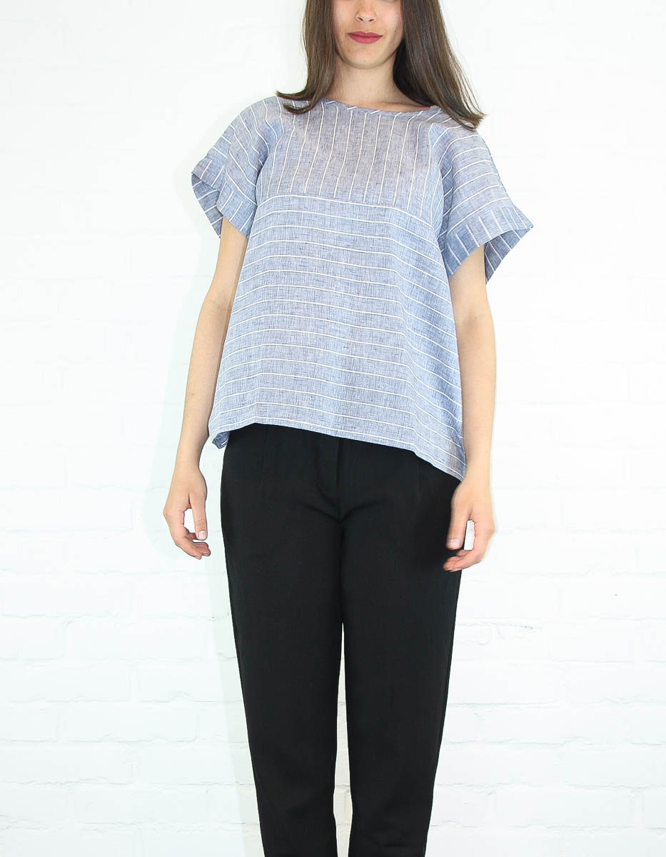 Denna härligt randiga blus i linnematerial är komplementet till din våroutfit. En extra häftig detalj med denna blus är att den går att ha åt två håll. Ringningen med öppning kan bäras både fram och i ryggen.