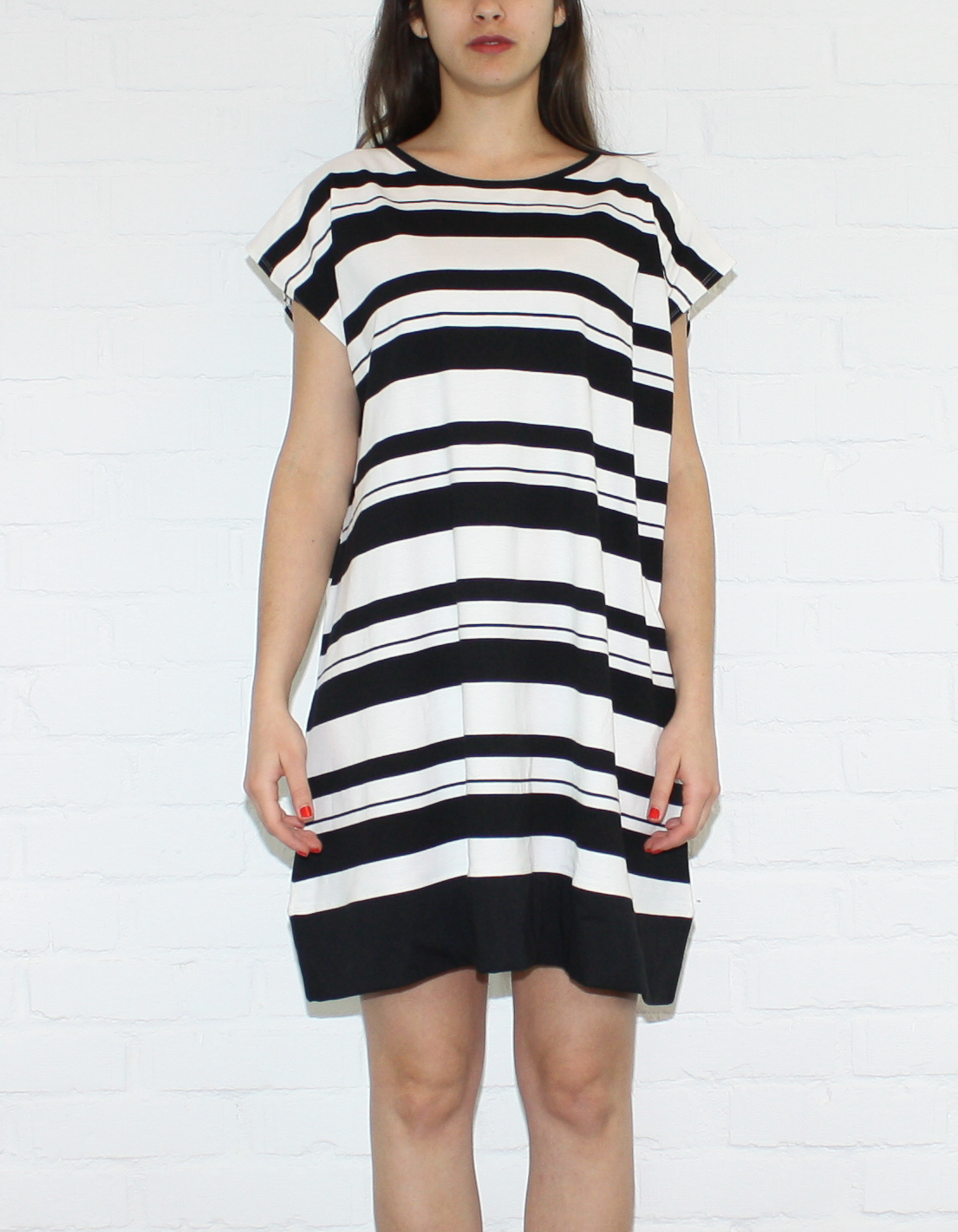 Addera ränder i din garderob med denna klänning. Dess avslappnade stil och mjuka material komplimenterar alla former och storlekar. Du blir vardagligt cool med ett par vita sneakers till!