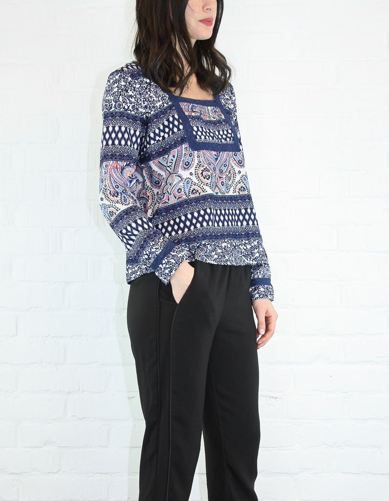 Mönstrad blus med fin brodyr i ringningen.