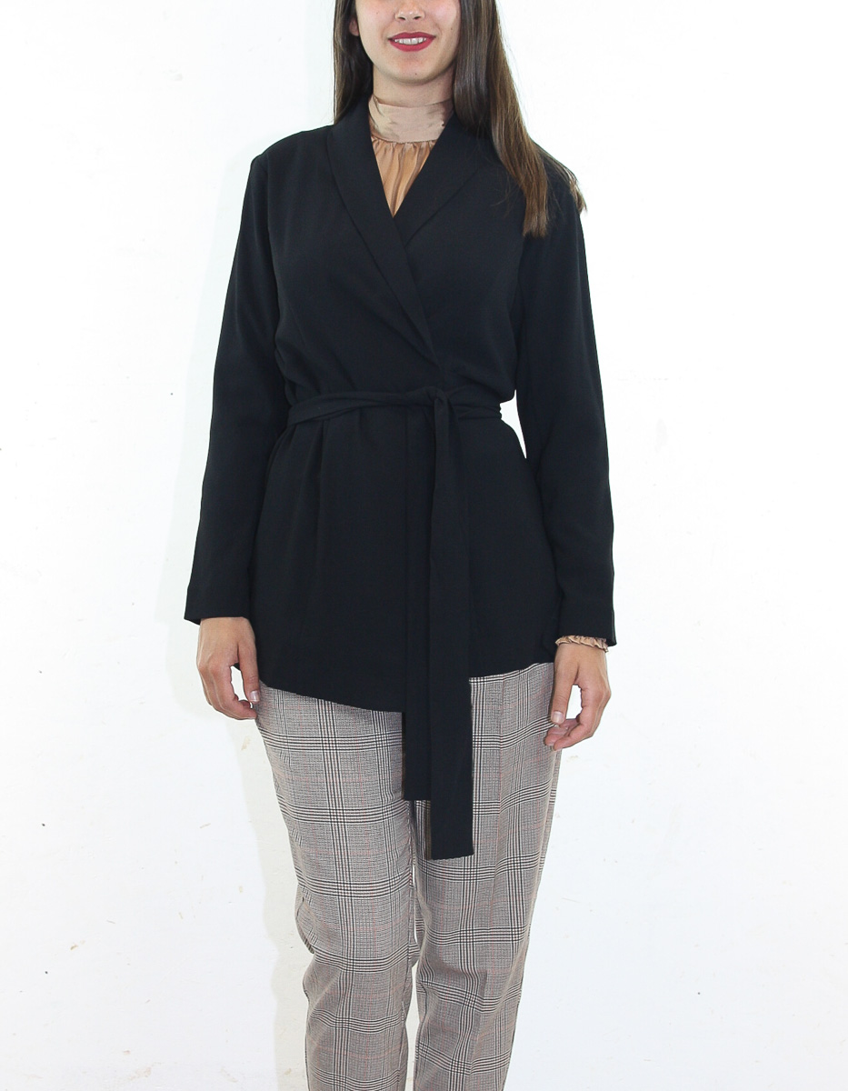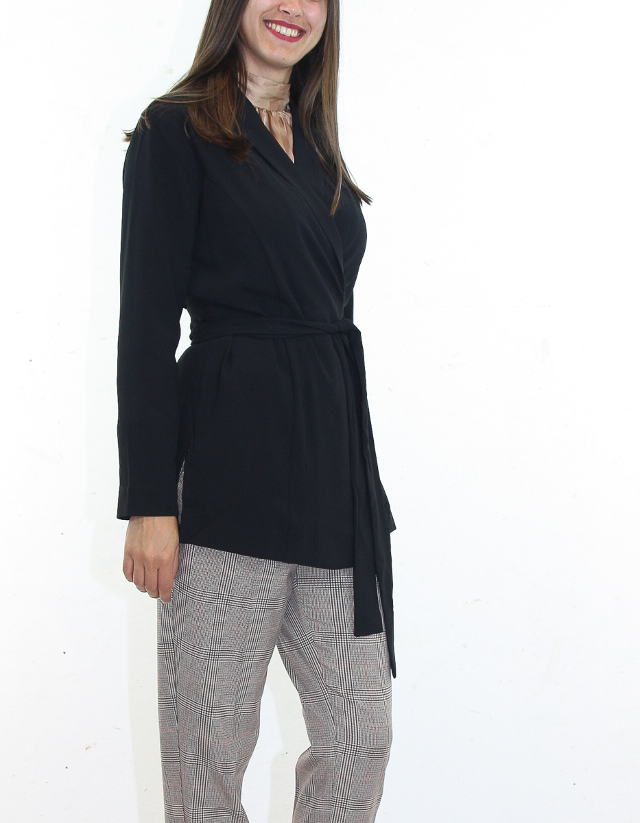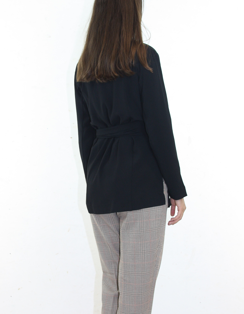 Kavaj i omlottmodell med knytband i midjan och slitsar i sidorna.