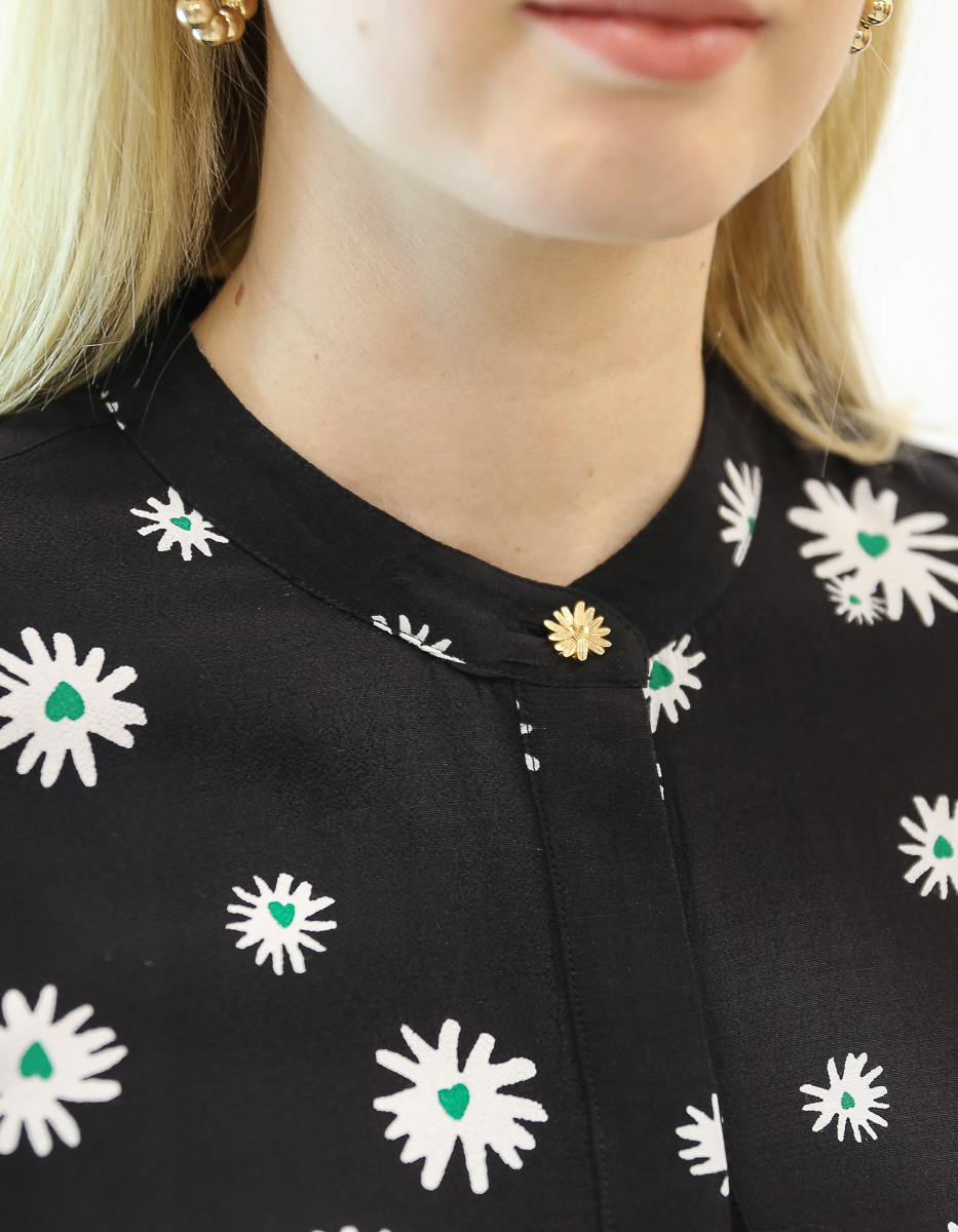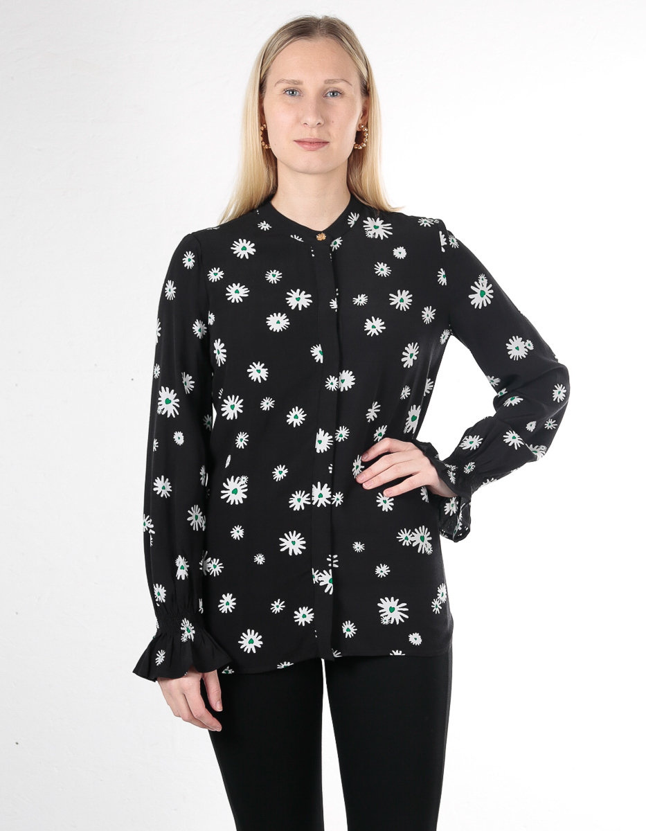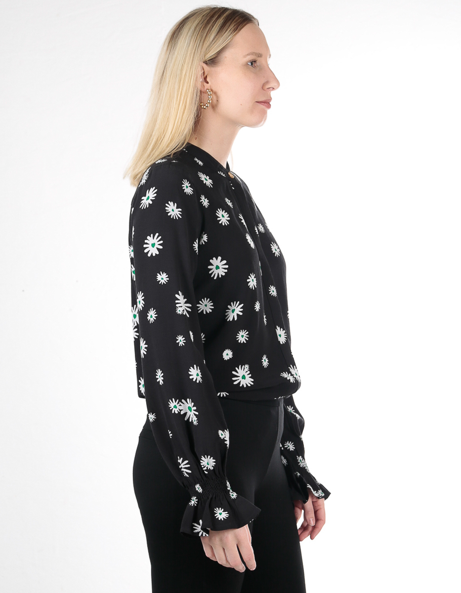 En löst åtsittande blus med långa ärmar med resår och volang i ärmsluten. Utsmyckad med en guldfärgad detalj i halslinningen.