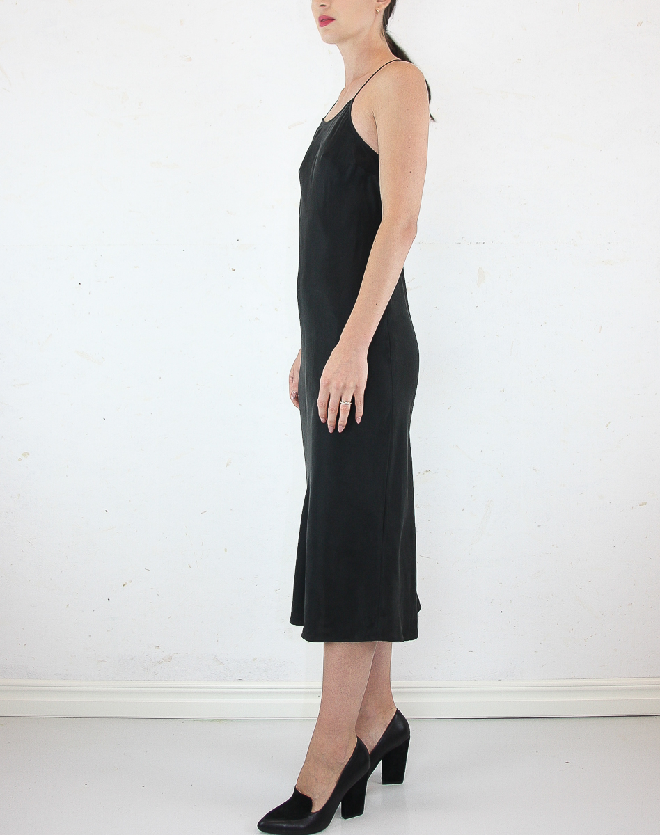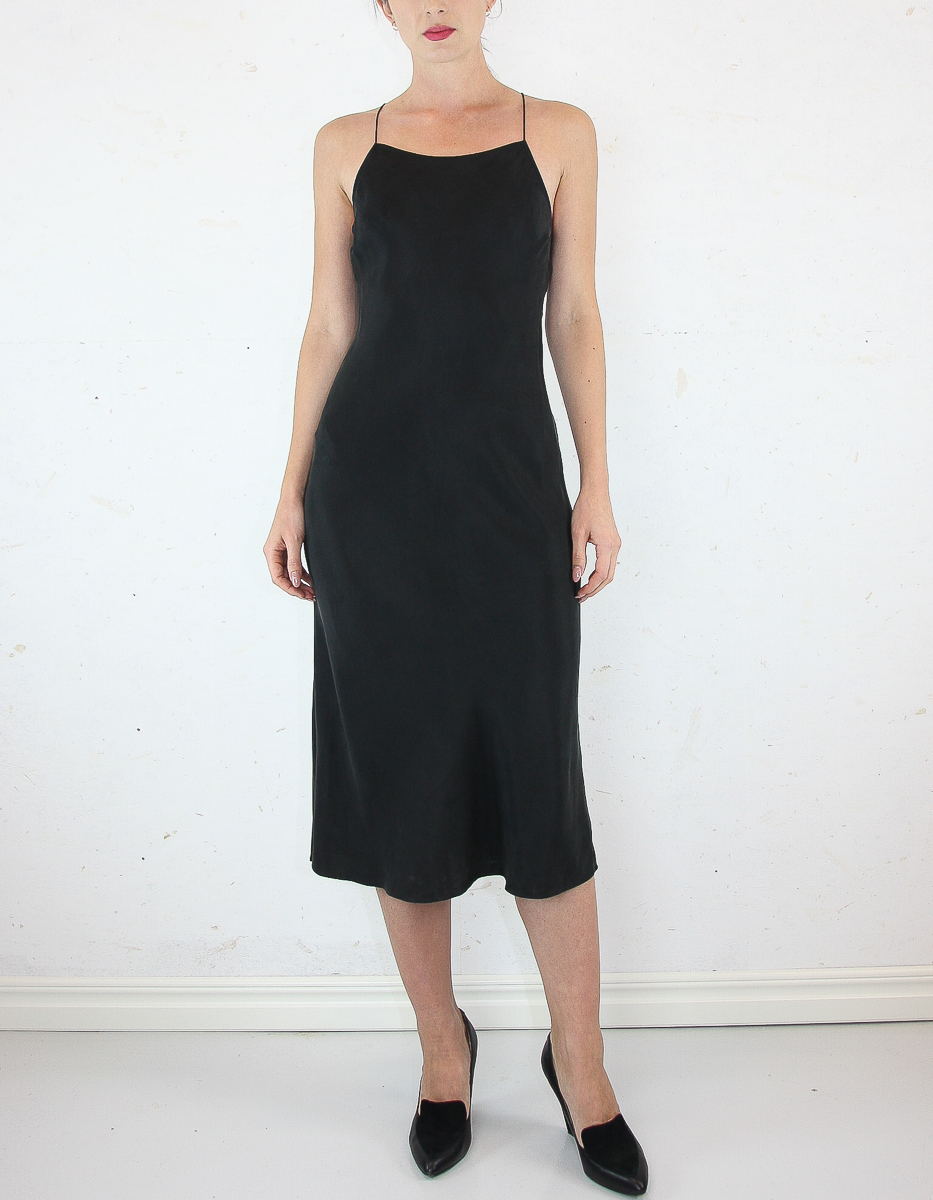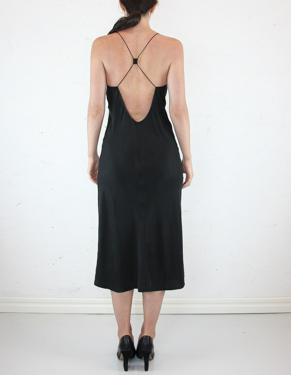En elegant men minimalistisk klänning med matt finish som ger en lyxig känsla. Låg rygg och axelremmar med korsdetaljer som skapar en extra feminin touch.