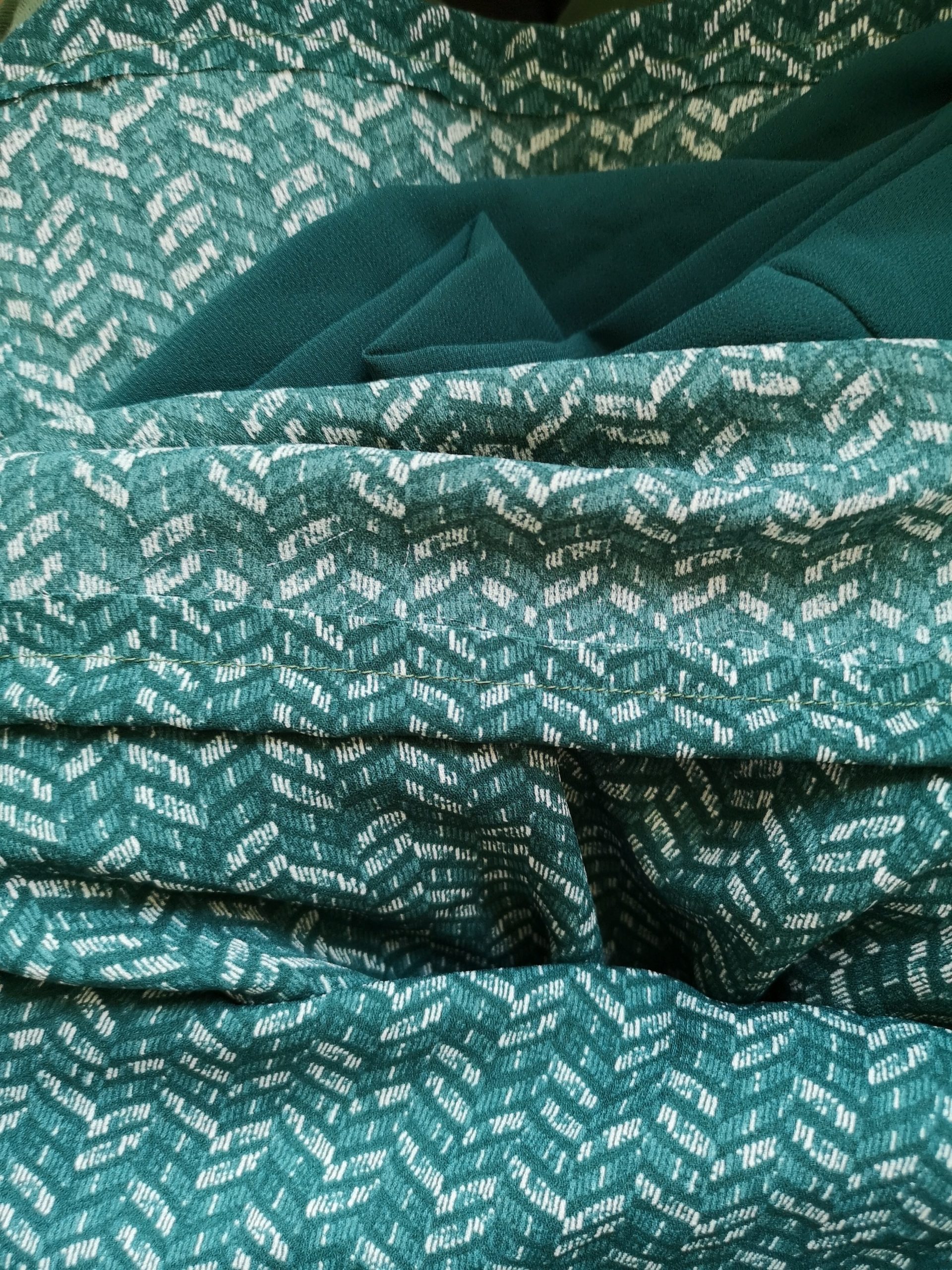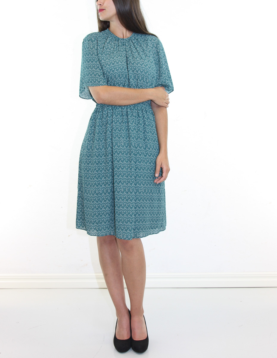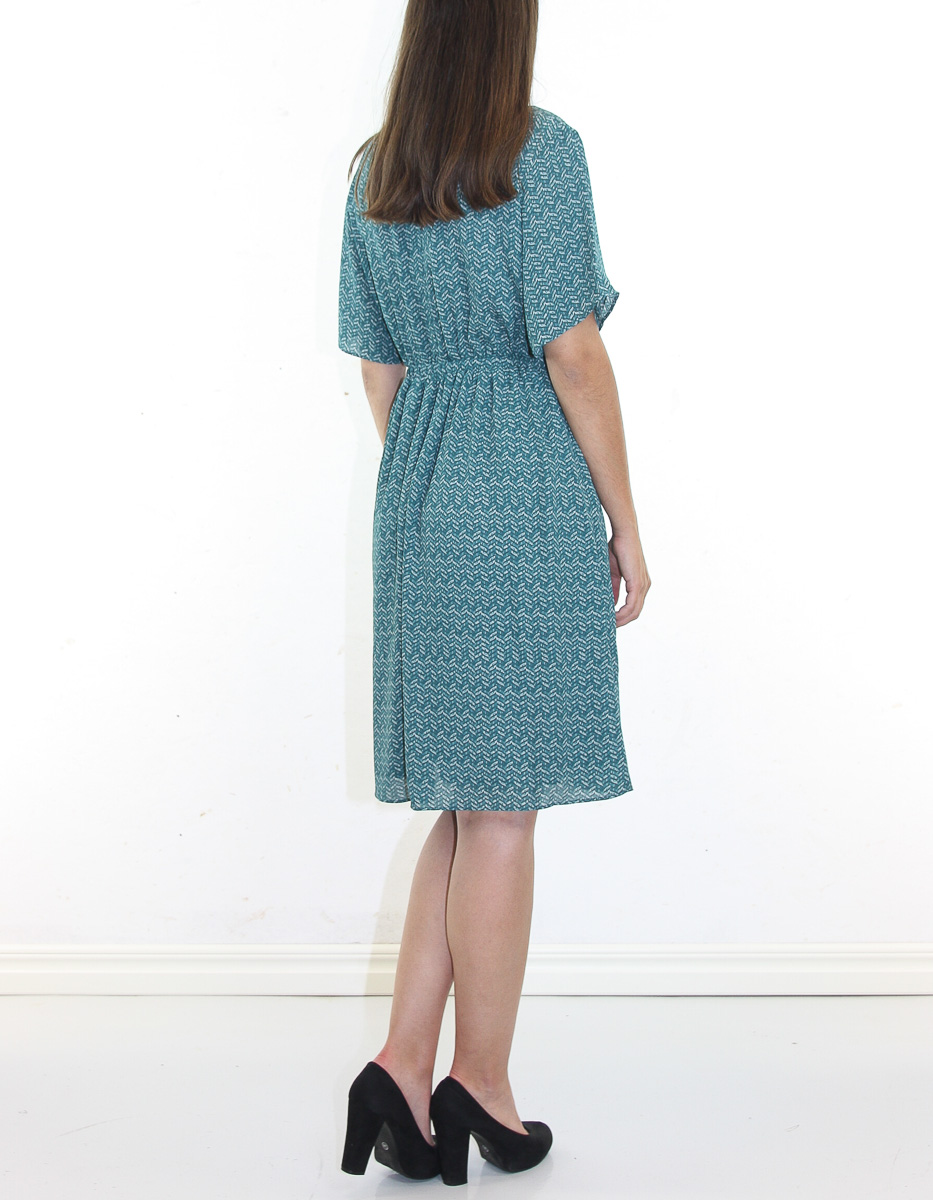 Denna klänning är skuren i knälång modell med en samlad hals, elastisk midja och “inseam”-fickor. Klänningen är gjord i ett tryckt polyesterchiffontyg tillverkat av återvunna plastflaskor.