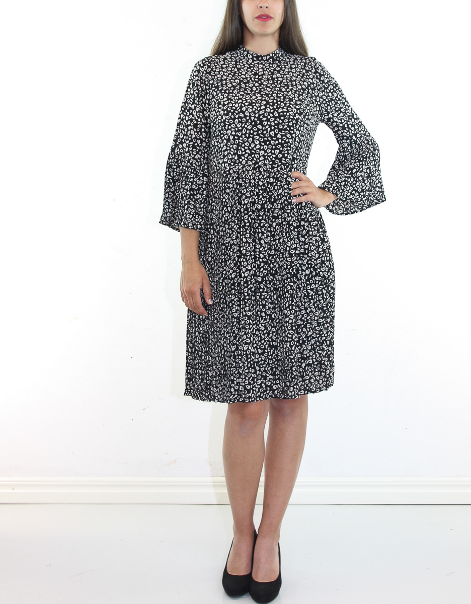 Knälång klänning i en avslappnad passform. Plisserad nederdel och trekvartsärmar.