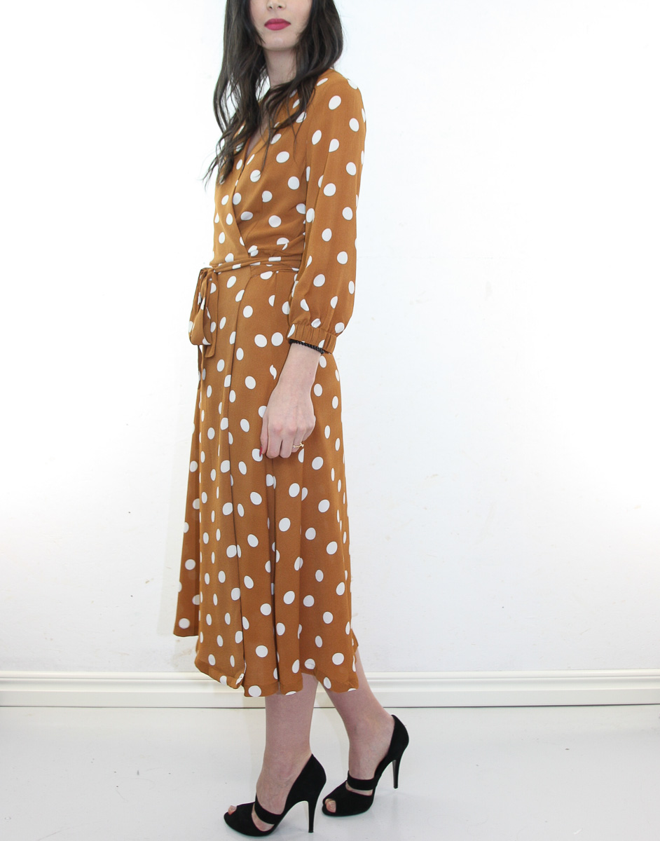 En härlig omlottklänning med orange grundfärg med vita prickar.