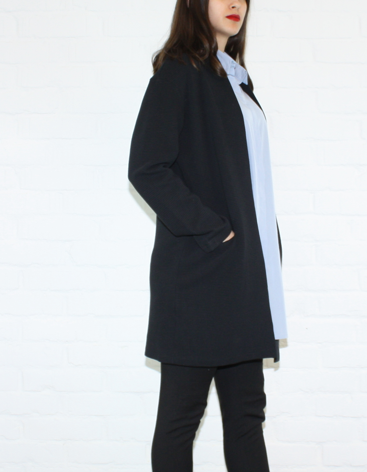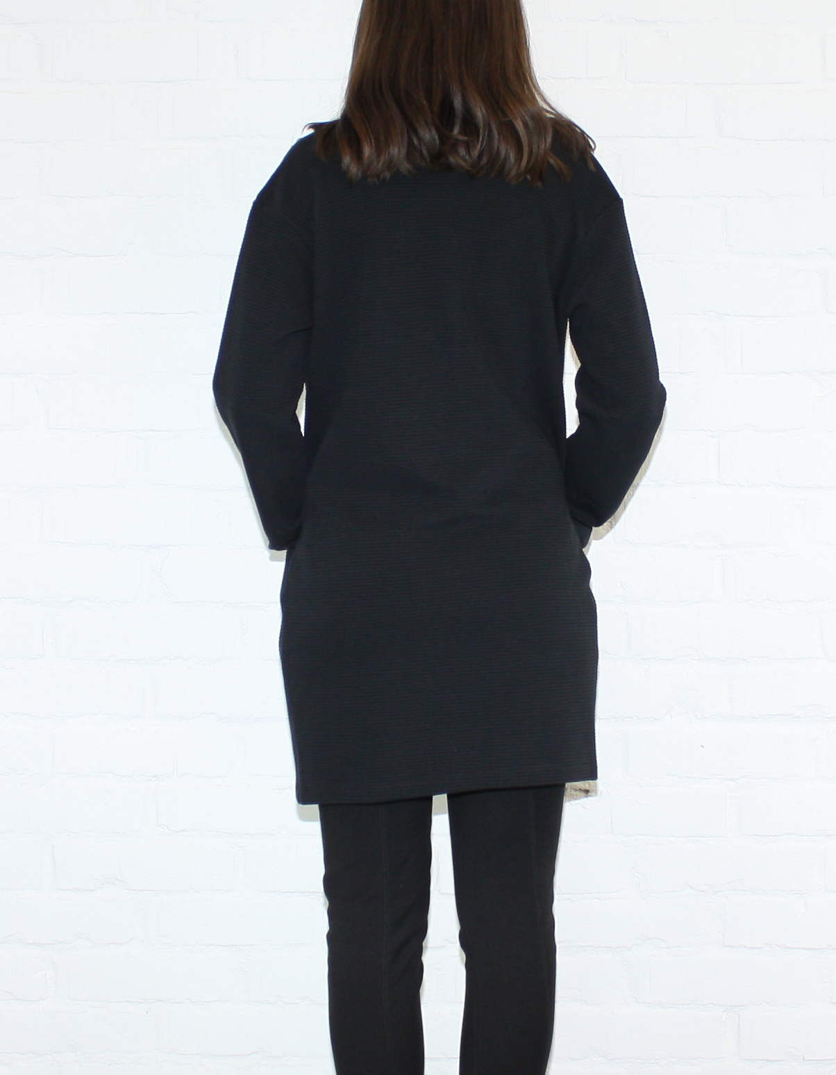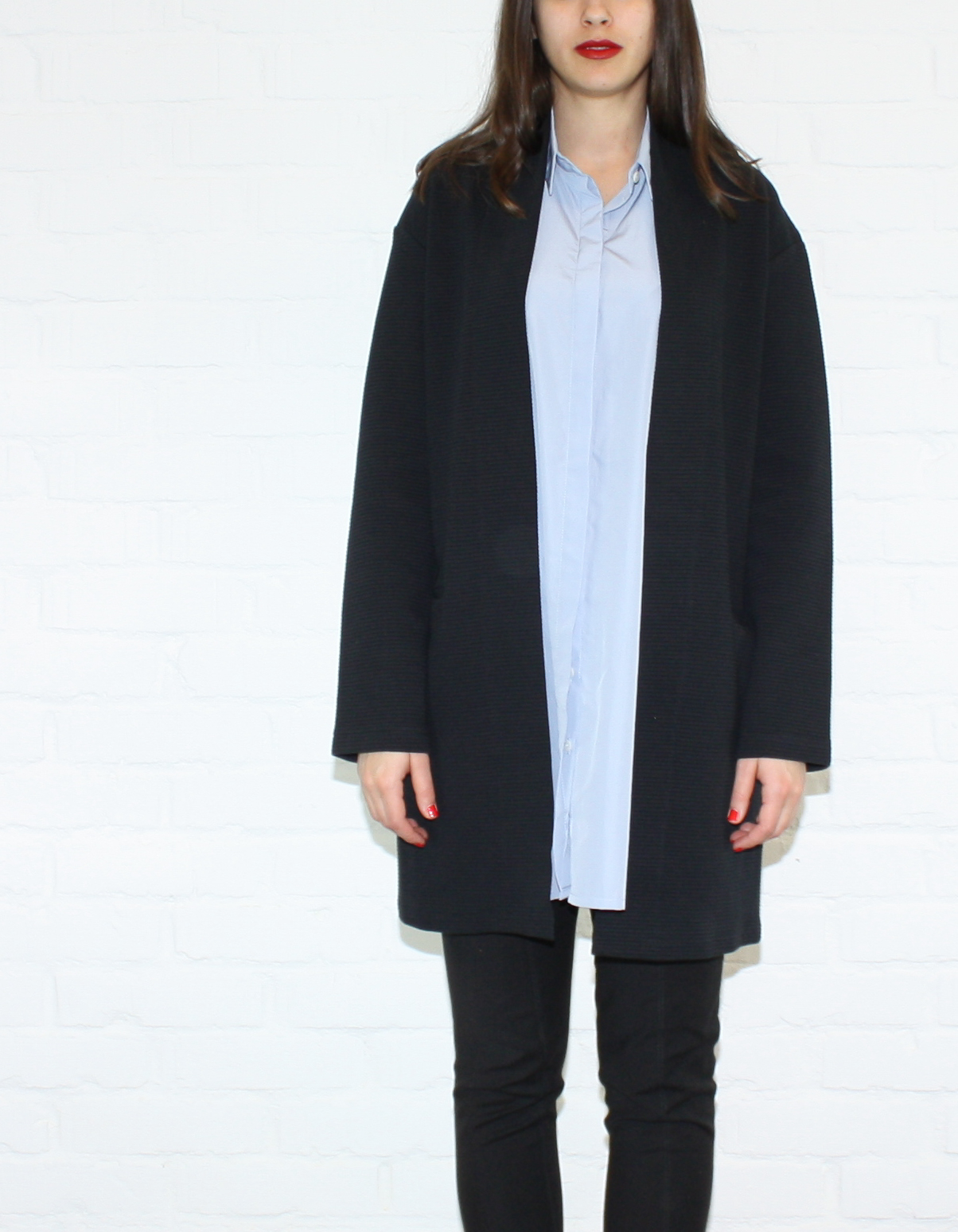 Denna mysiga kofta är ribbad, har två stora fickor och ingen knäppning. Den är lätt äggformad, även kallat O-form. Koftan fungerar även som en lätt kappa på våren eller sommaren.