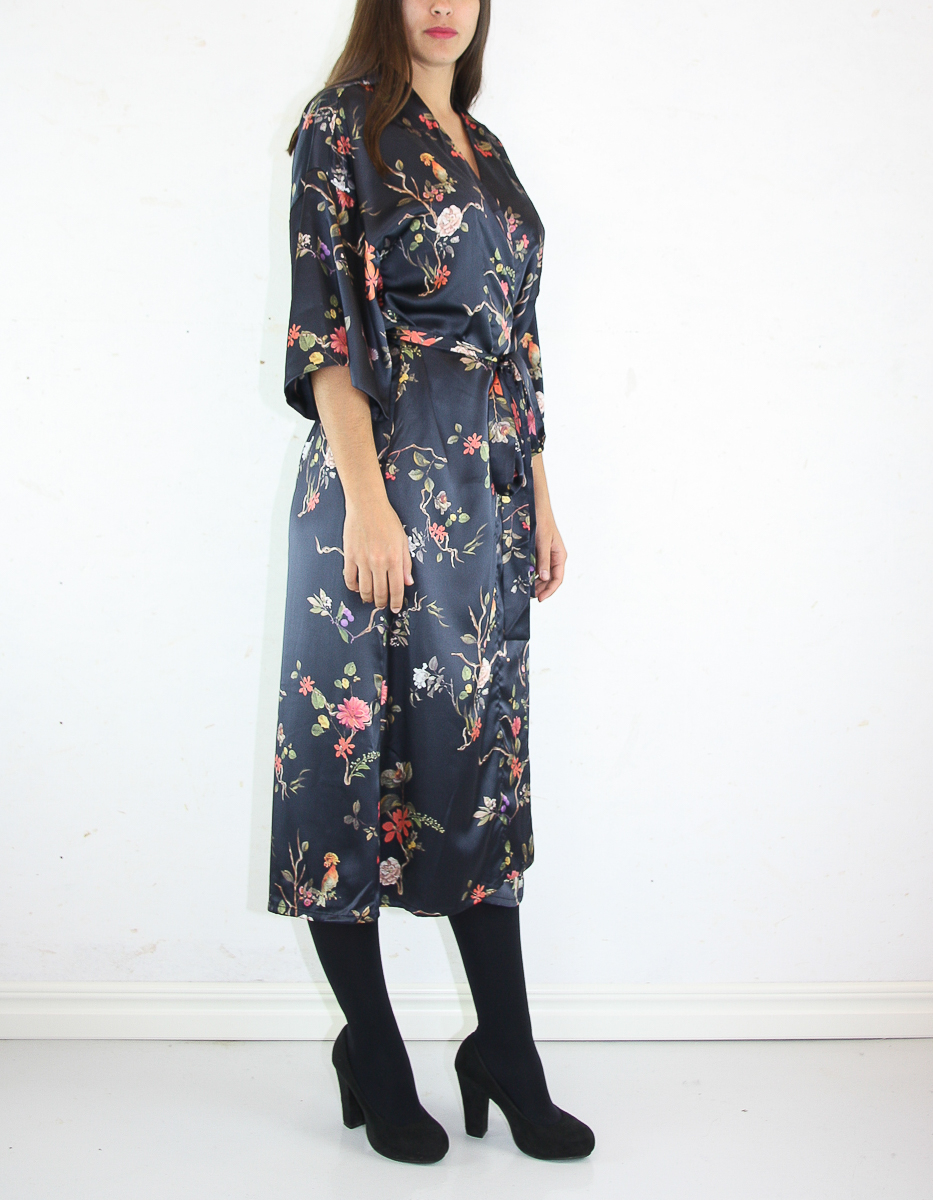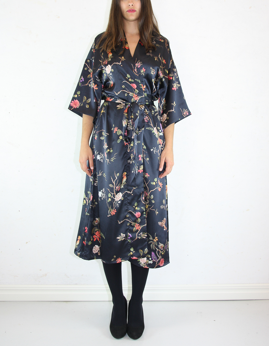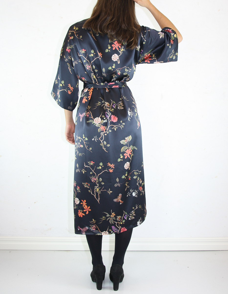 En printad kimono-klänning tillverkad av ett högkvalitativt återvunnet polyestertyg. Tyget andas, känns smidigt och silkeslent mot huden. Den har en avslappnad, lång passform och har ett bälte och breda ärmar som slutar runt armbågen.