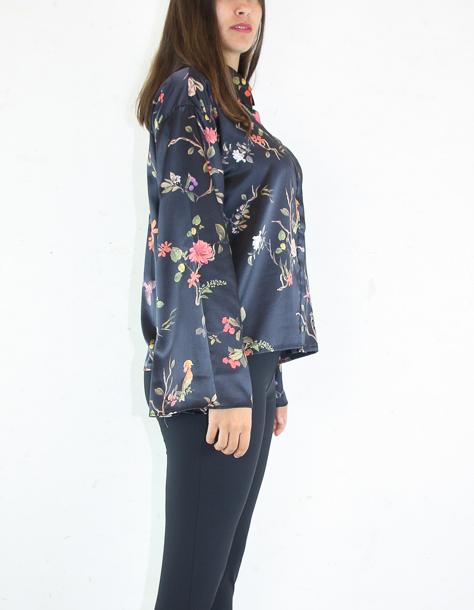 Denna skjorta är gjord av underbar återvunnen polyester, har vida ärmar och en ganska kort och boxig passform.