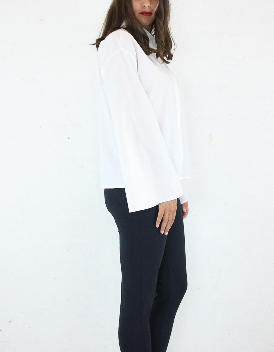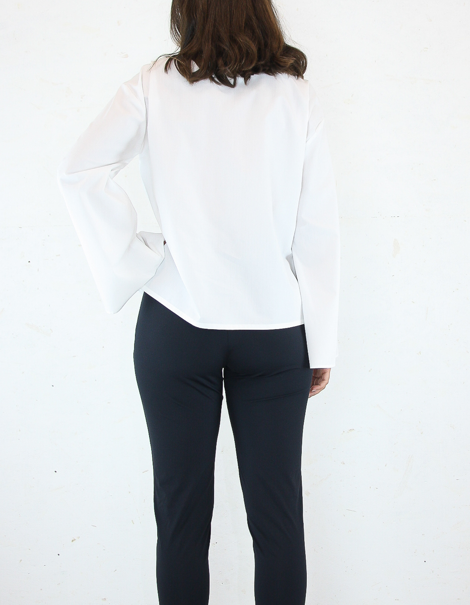 Med denna vita skjorta med utsvängd ärm ser du sofistikerad ut och den passar vid nästan varje tillfälle. Matcha med jeans för en ledigare look eller med svarta byxor för den mer professionella och moderna stilen.