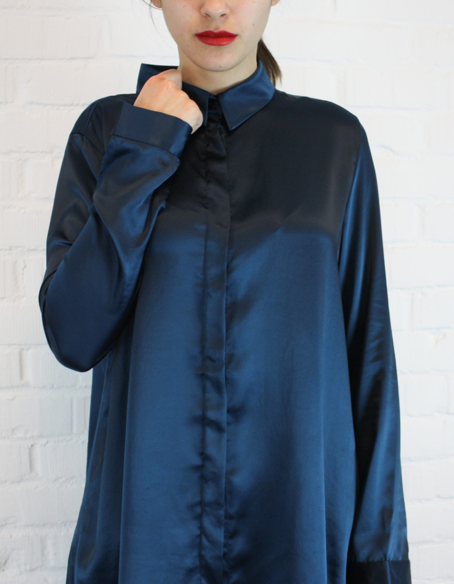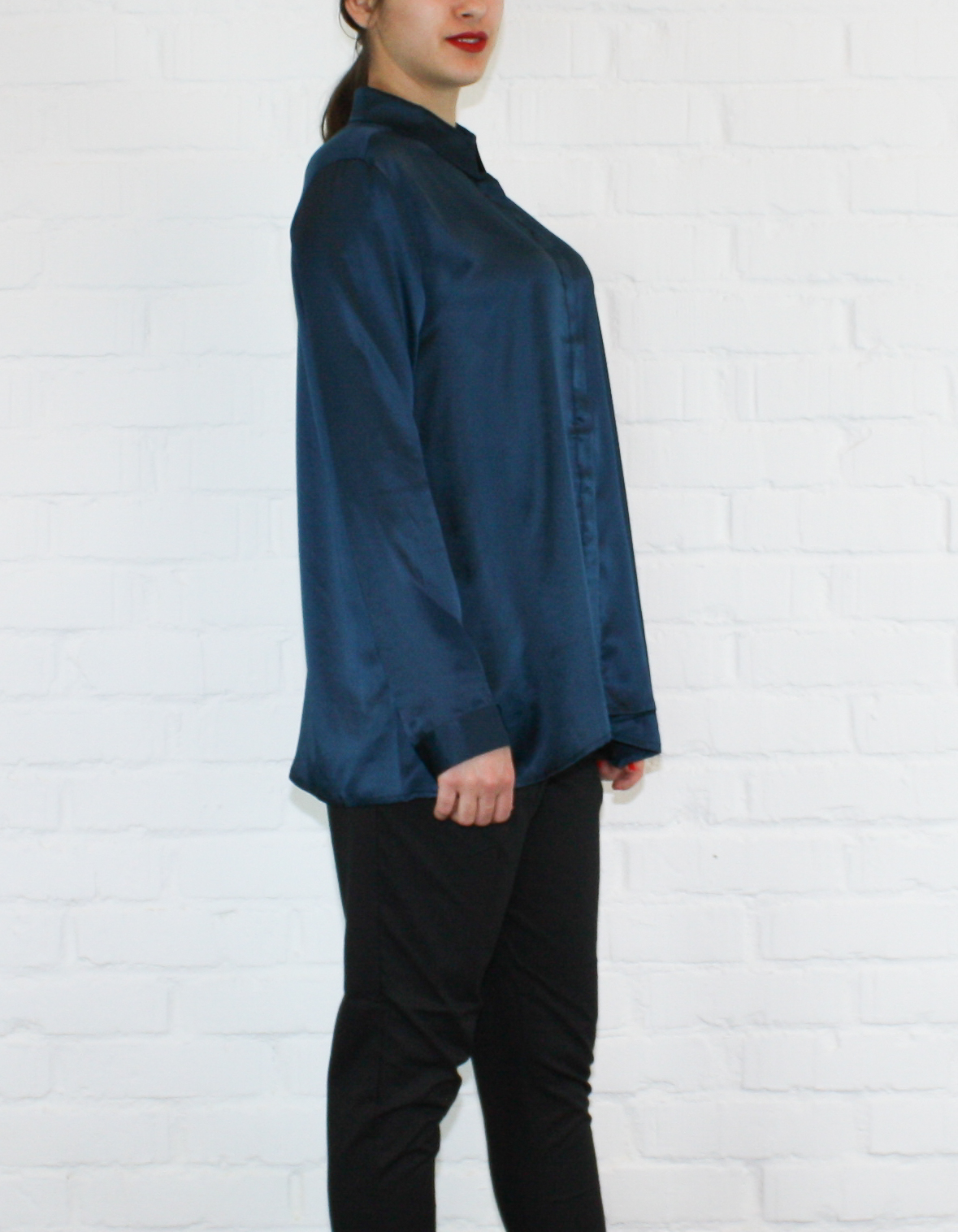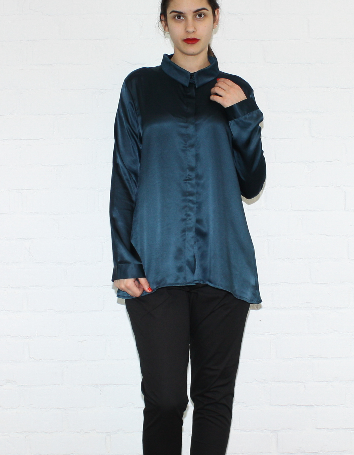 Denna skjorta i silkesliknande material av återvunnen polyester, är lätt A-formad vilket gör att den sitter lite lösare kring höfterna.