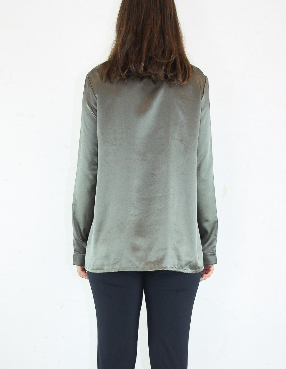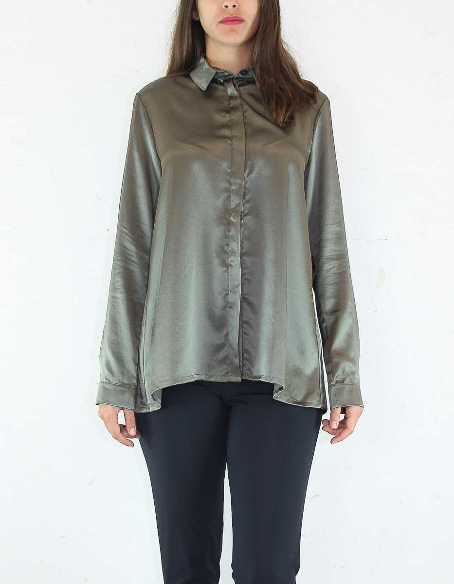 Formen påminner om ett A, vilket innebär att den blir lite bredare runt höfterna. Skjortan är gjord av högkvalitativ återvunnen polyester och tyget känns som siden, men det är helt veganskt.