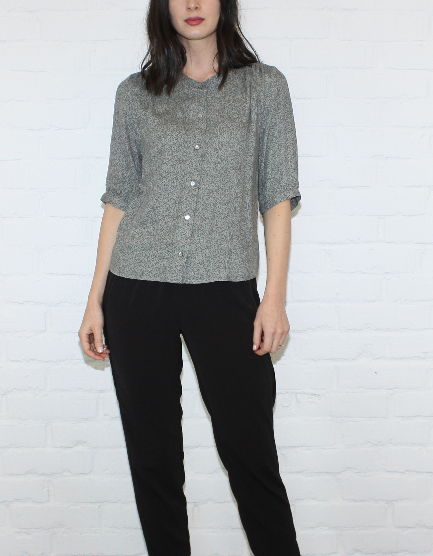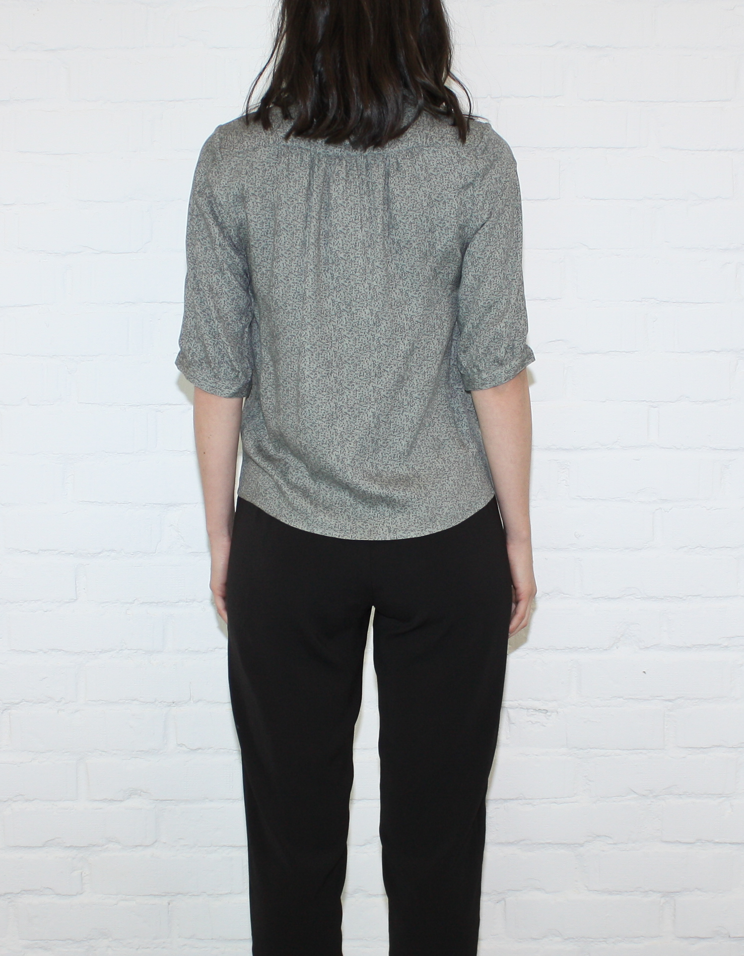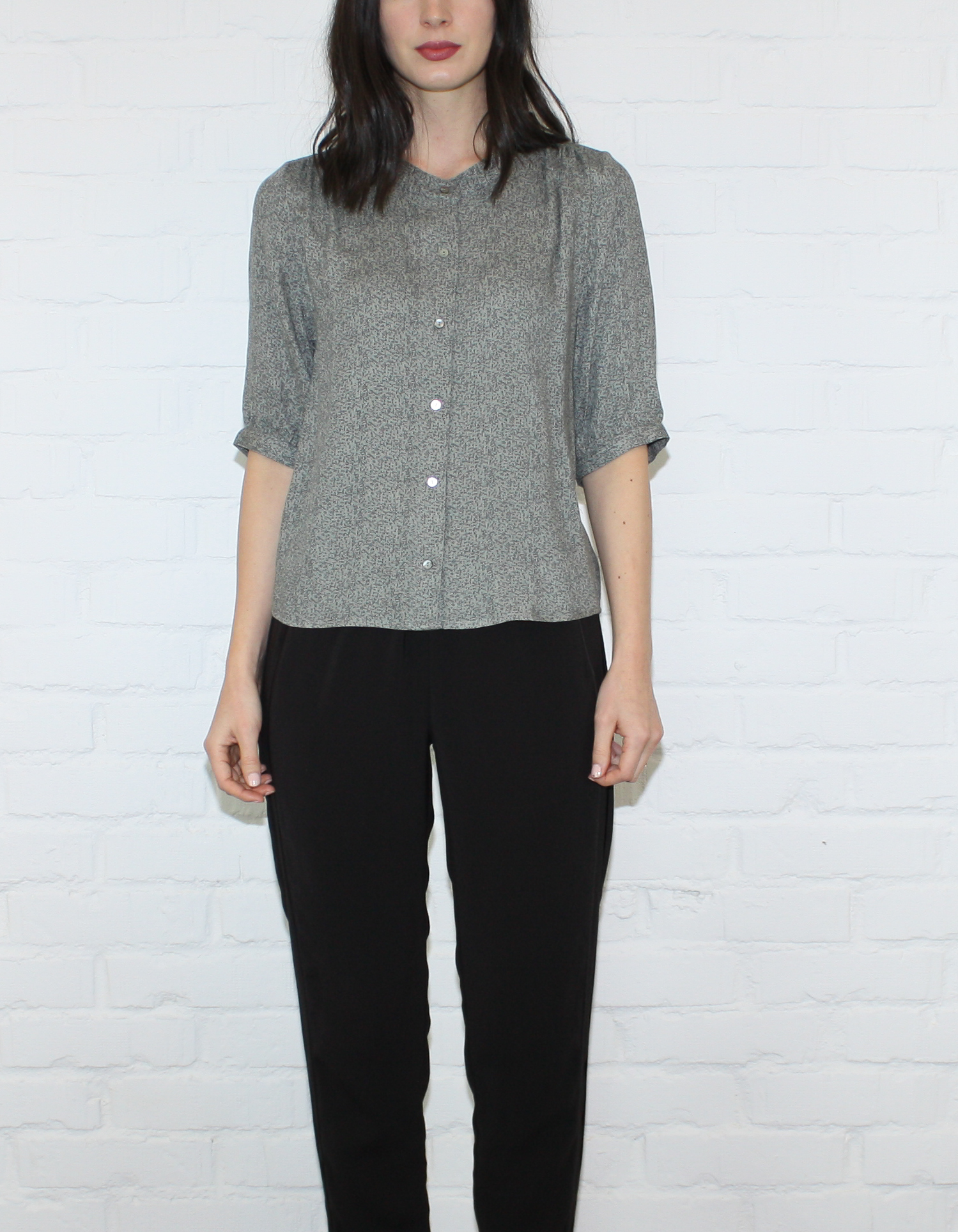 En blus i lätt material i viskos och ull. Tyget har små, små prickar som mönster. Armbågslängd på ärmarna. Pärlemorsknappar framtill.