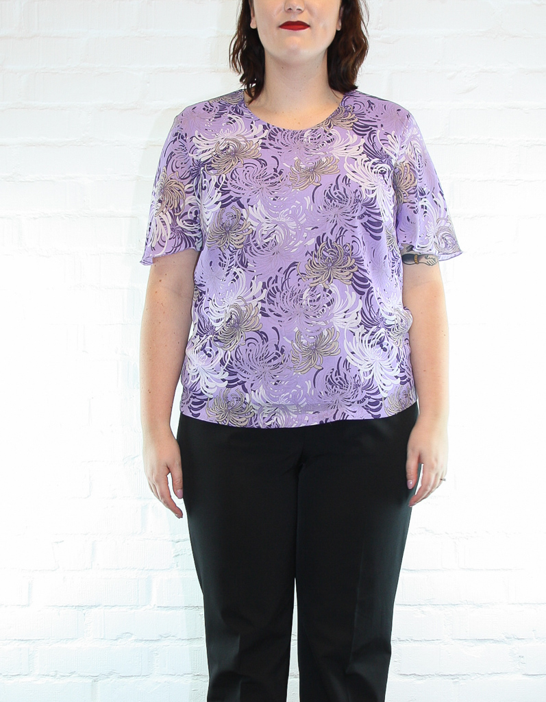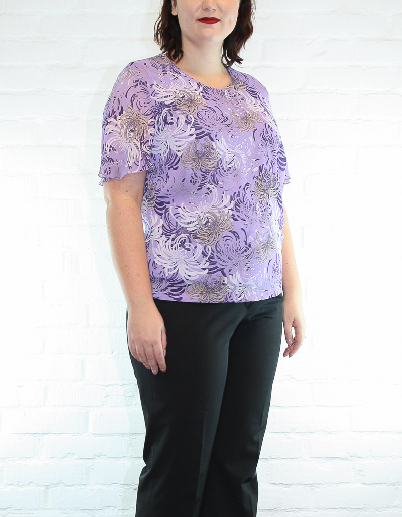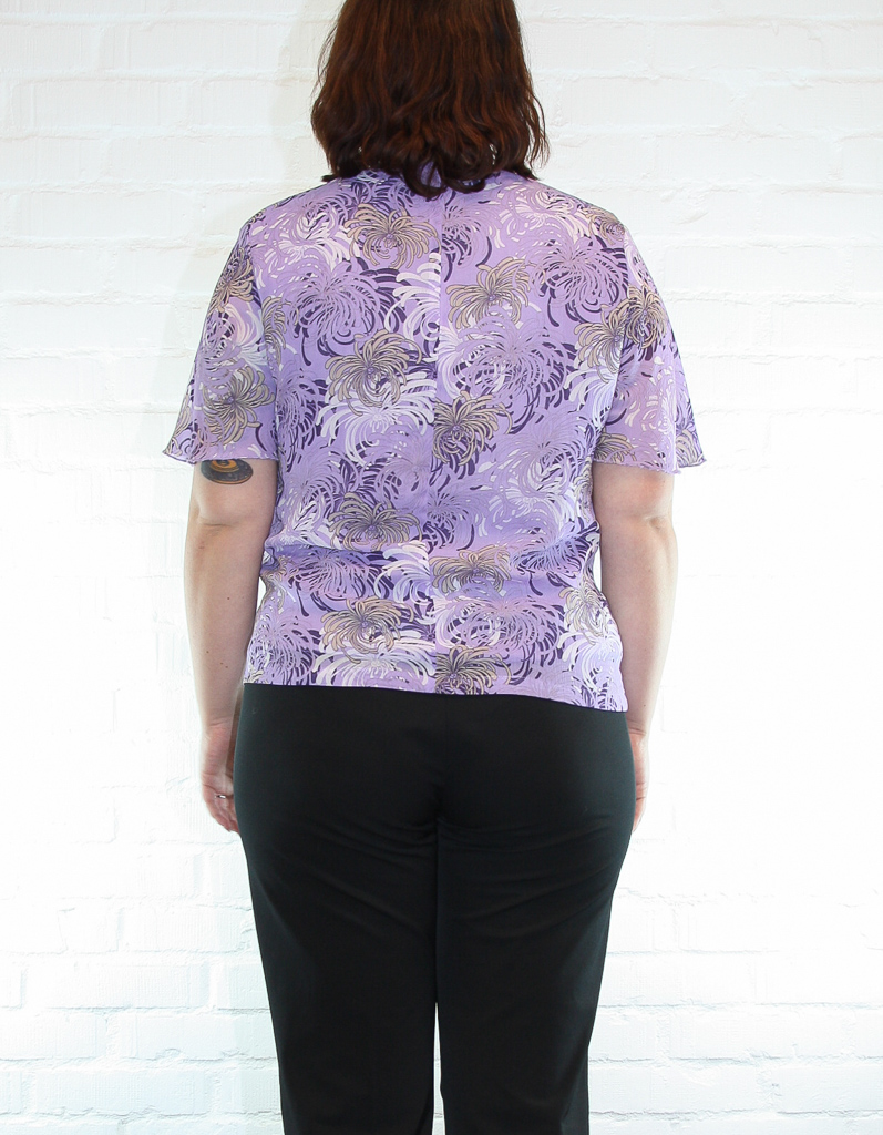 En lavenderlila blus med blomstermönster och skira, vida ärmar. Dragkedja bak.