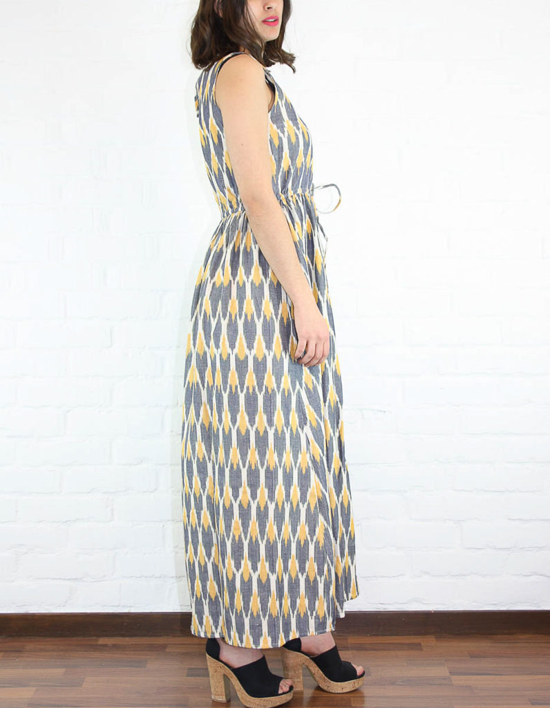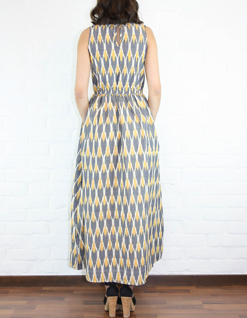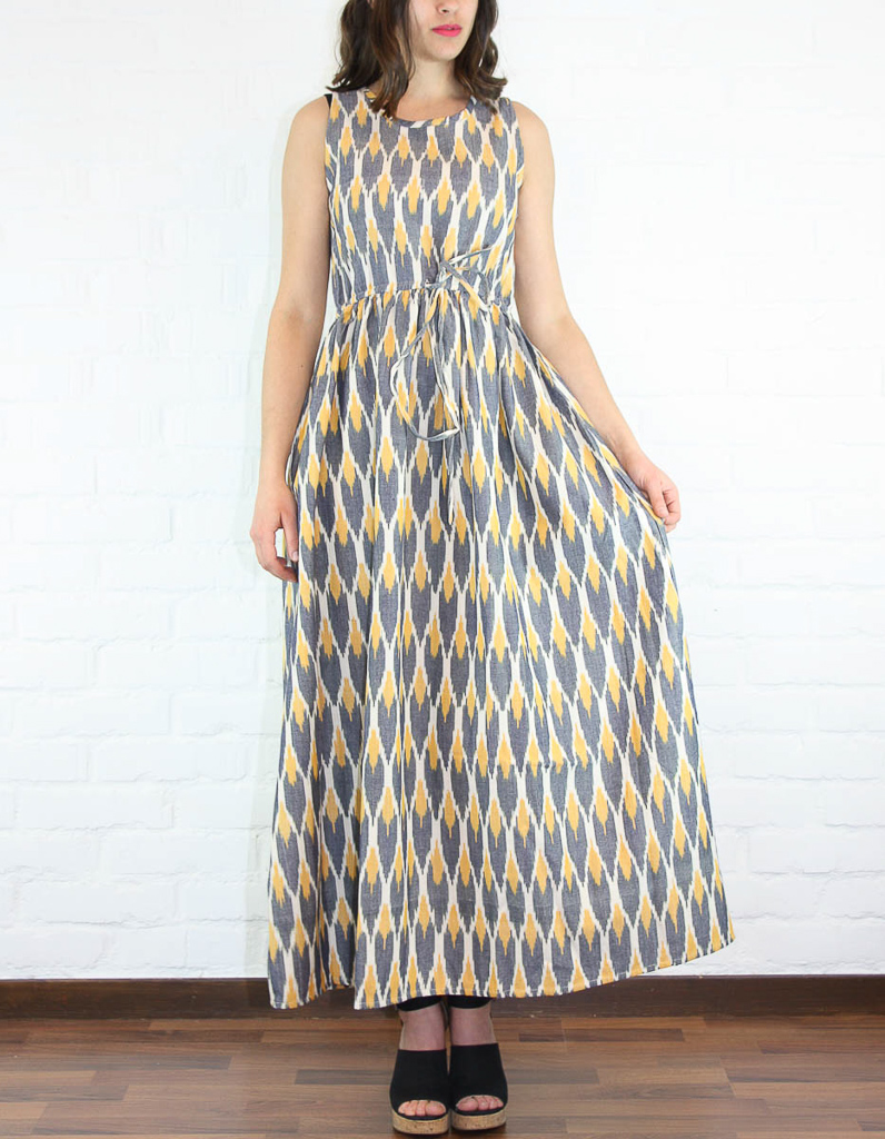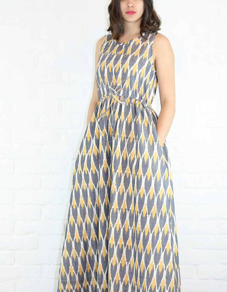 Långklänning i grovt bomullstyg, med mjuka färger. Den har ett knytband i midjan, dolda fickor i sidorna och nyckelhålsknäppning med träknapp i nacken.