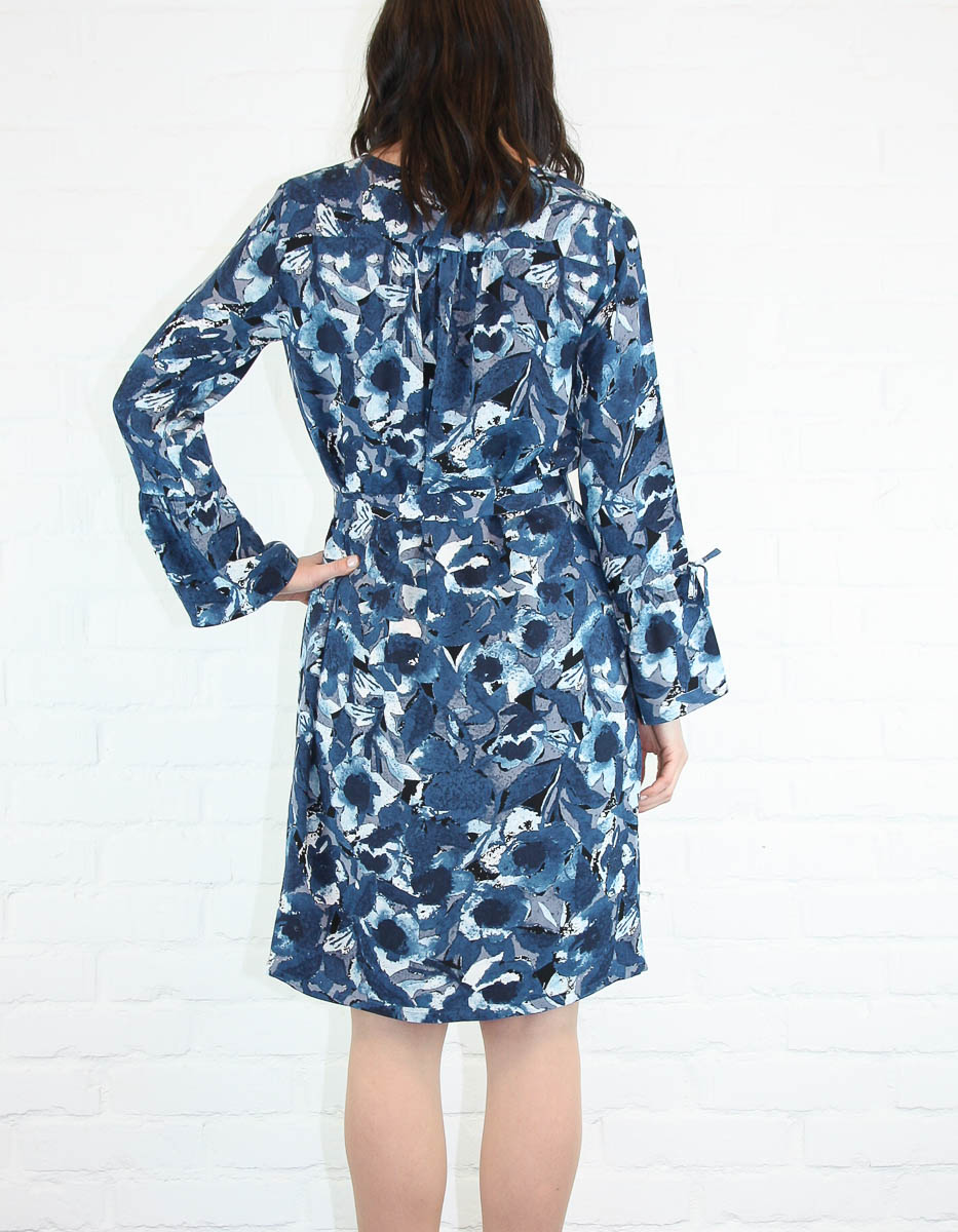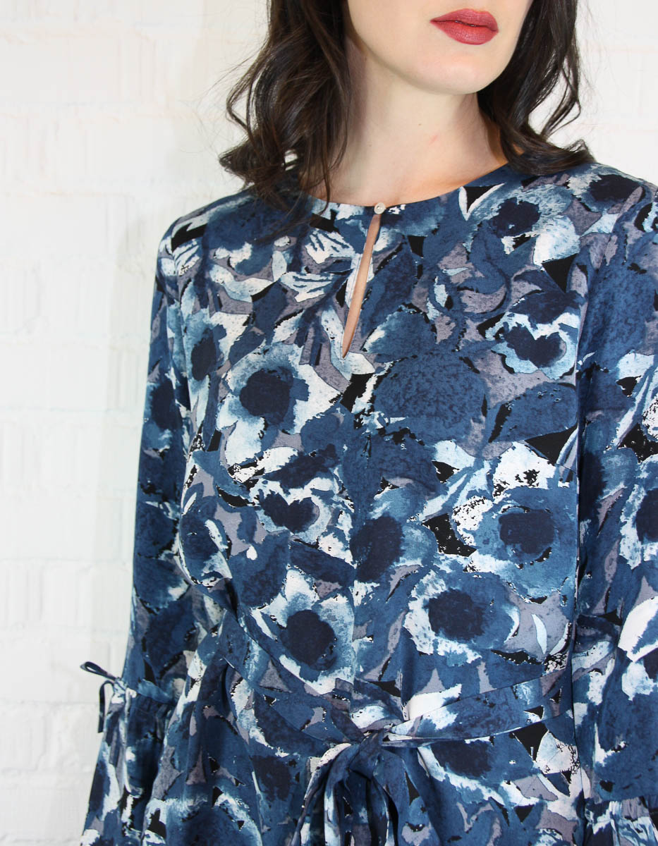 En klänning med rundad ringning, nyckelhålsknäppning i halsen, dolda fickor samt knytband i midjan. Ärmarna är lätt klockade.
