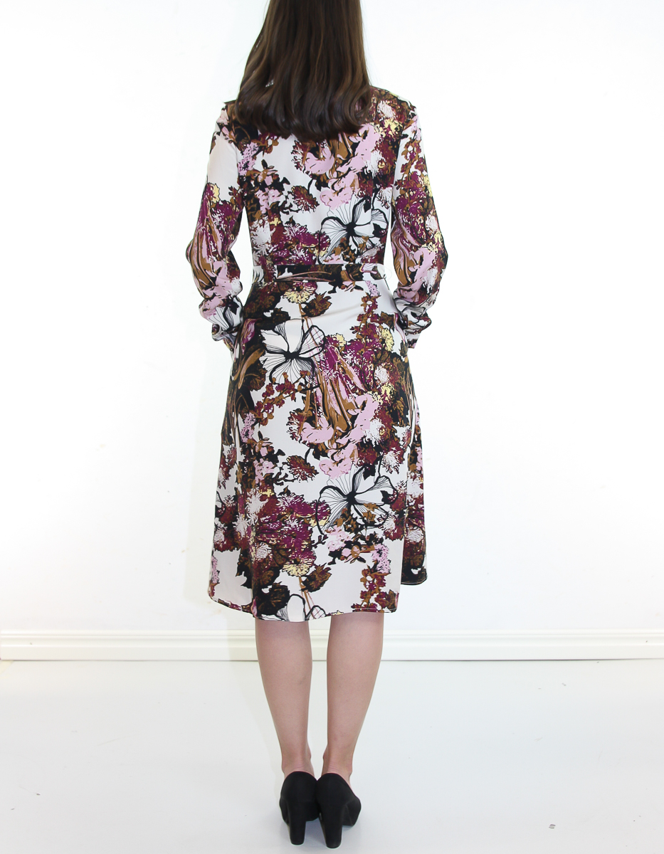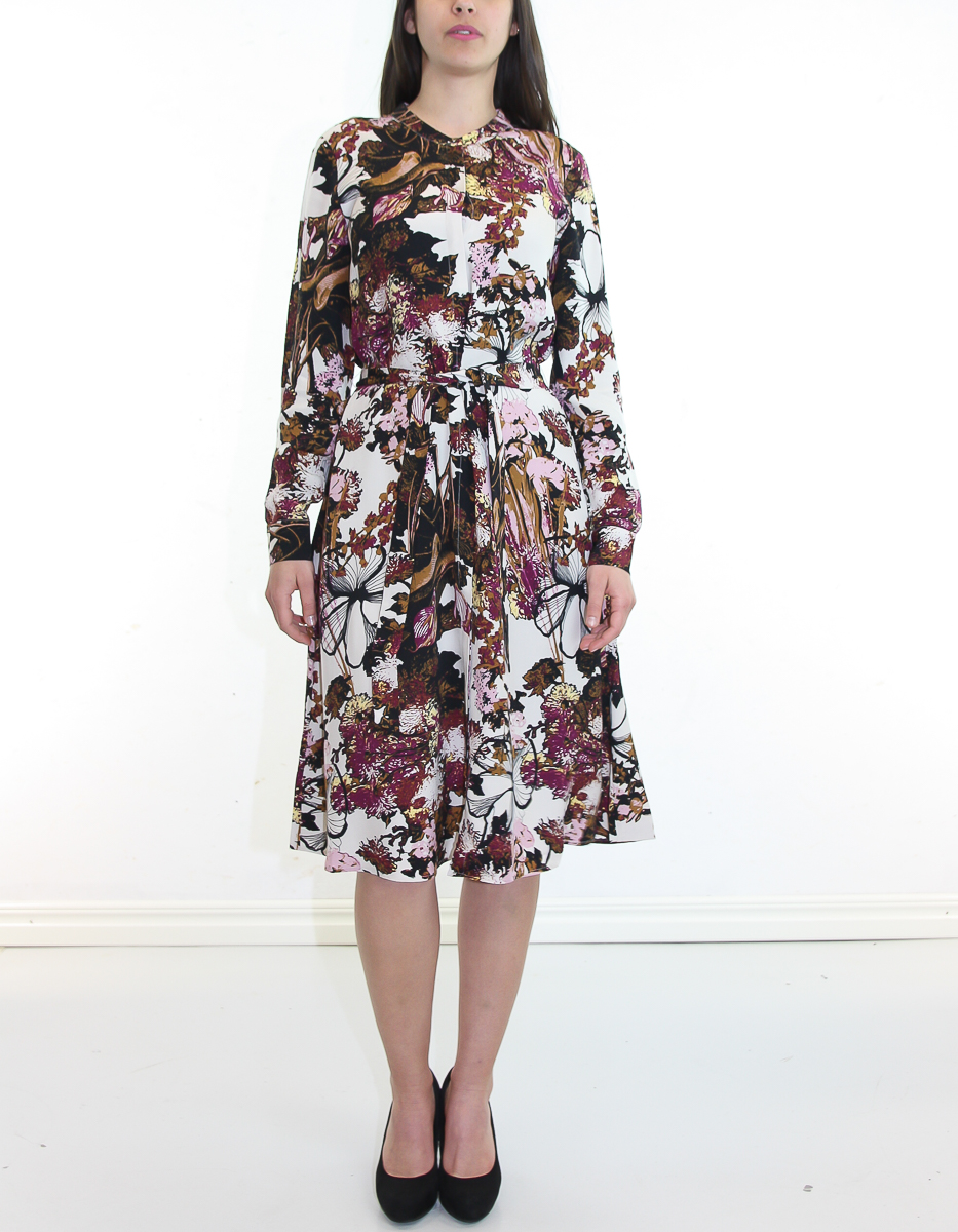 Klänningen är i ett mjukt tyg med en feminin siluett, ett detaljerat mångfärgat tryck, dolda knappar, en platt krage, ett matchande bälte i midjan och långa ärmar med knappar.