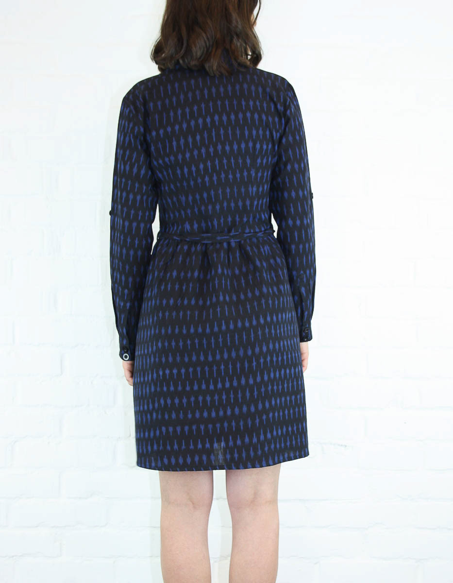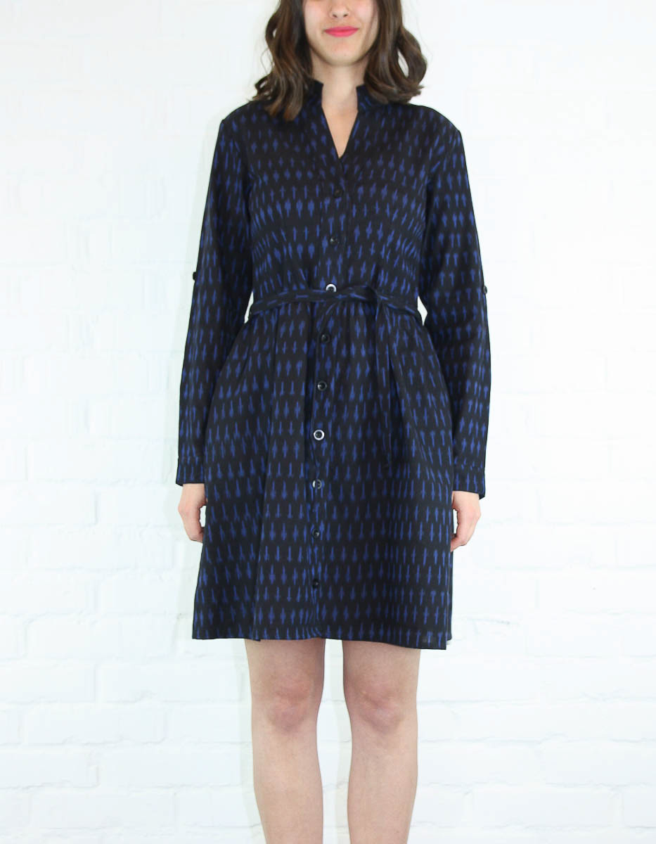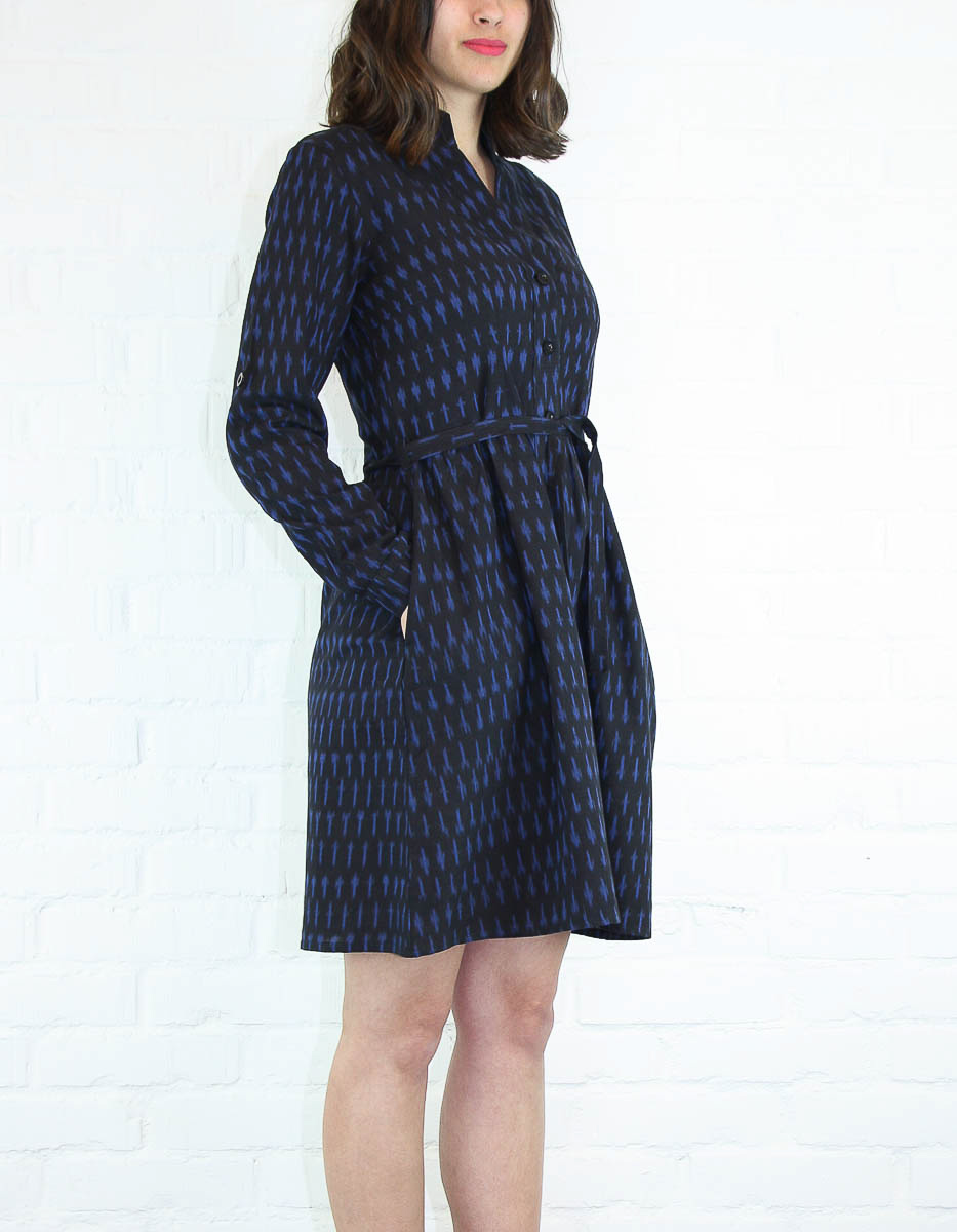 En klänning med lång ärm som går att vika upp och fästa med knapp. Klänningen har sidofickor och knytband i midjan.