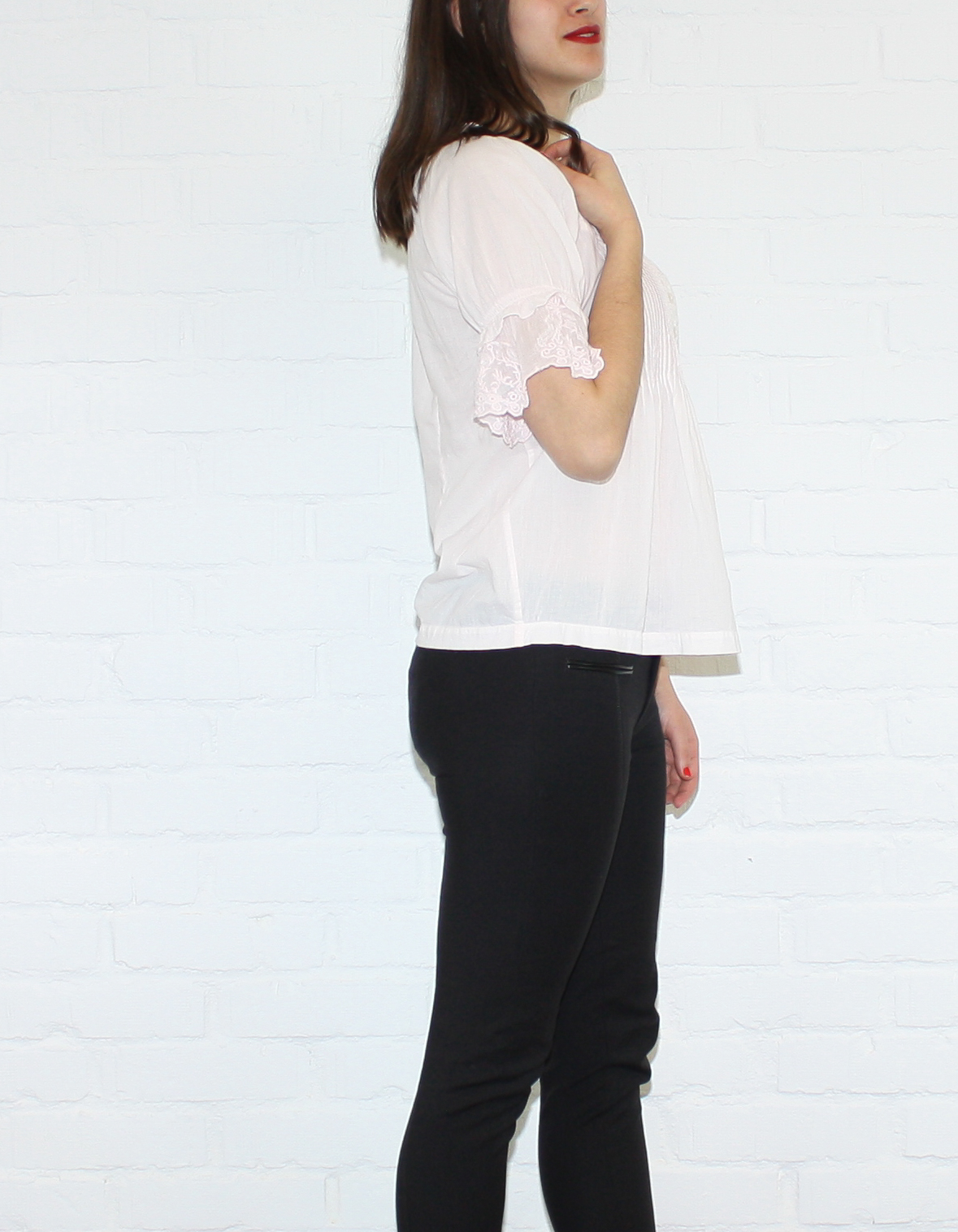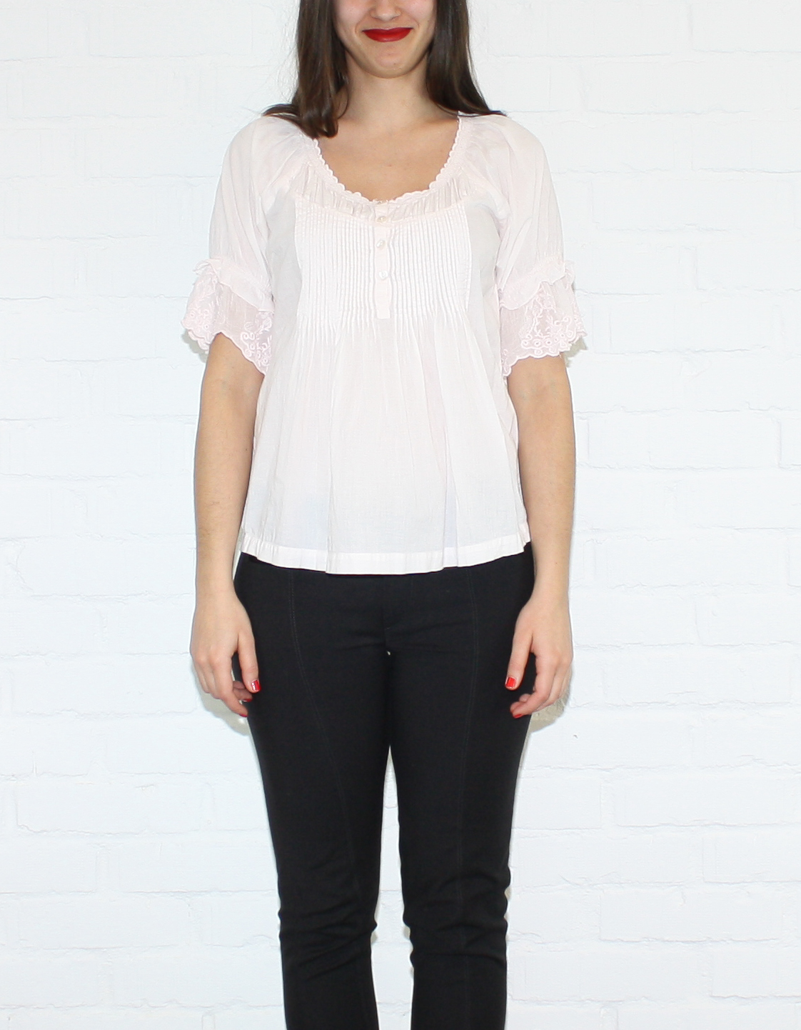En blus med lite kortare ärm och där ärmslutet har en liten volang. Bak i nacken är ett silverfärgat tryck av en fjäril.