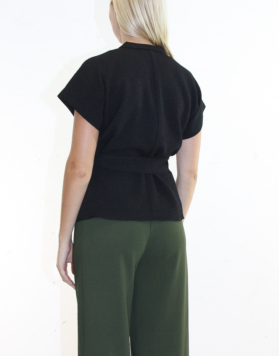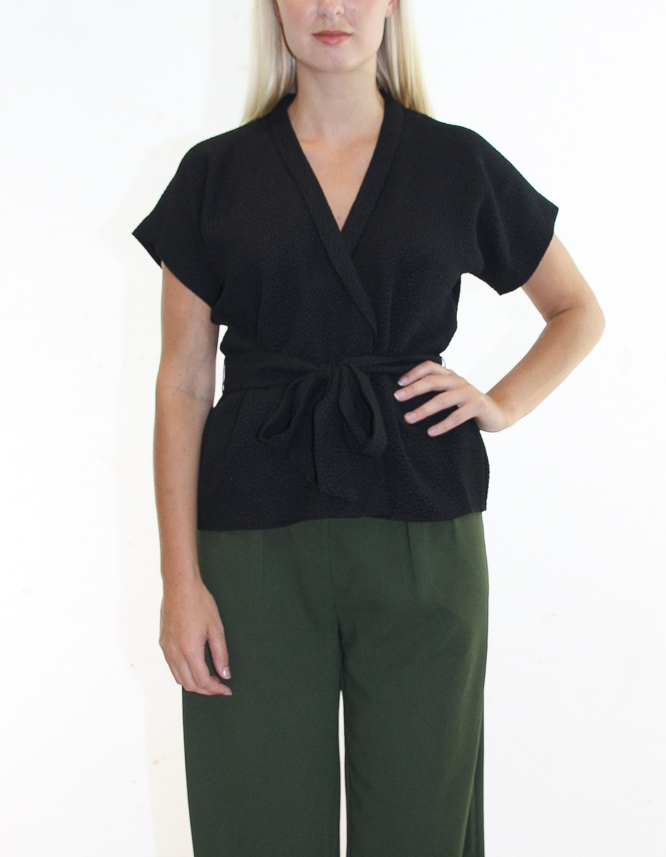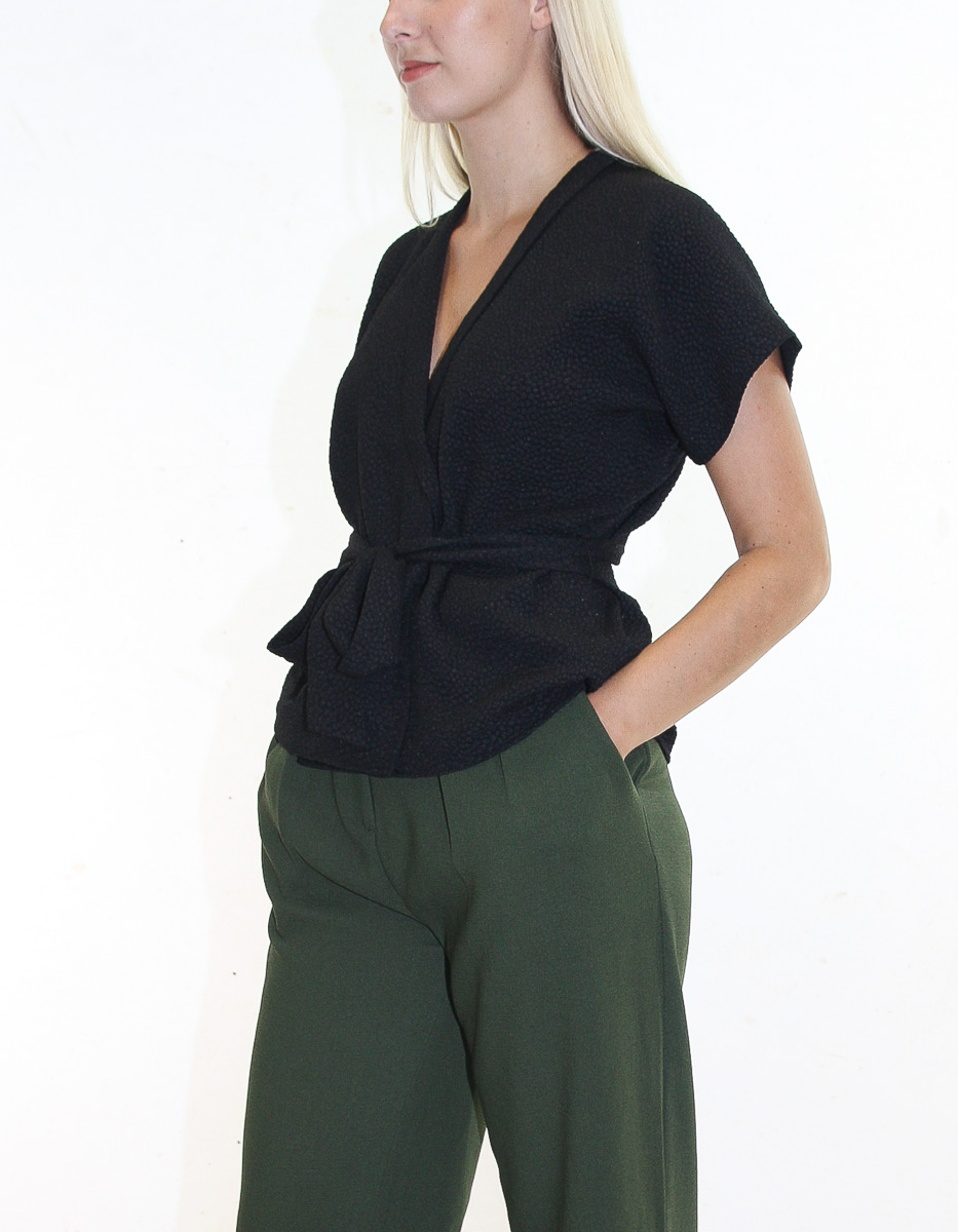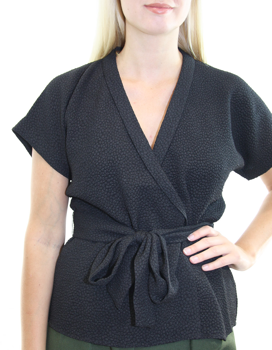 Feminin wrap-topp som är tillverkad av ett texturerat jacquardtyg. Toppen fästs i midjan med ett matchande bälte.