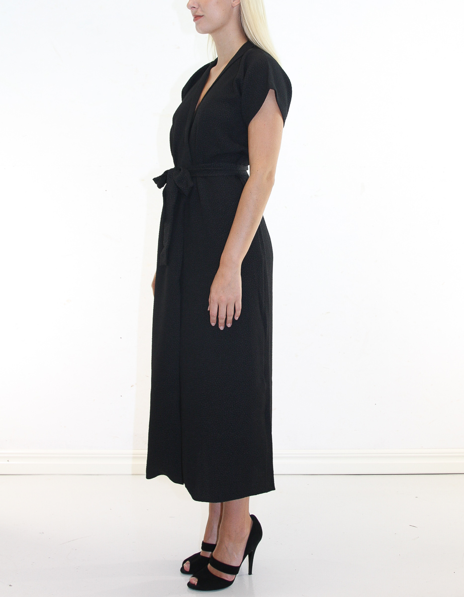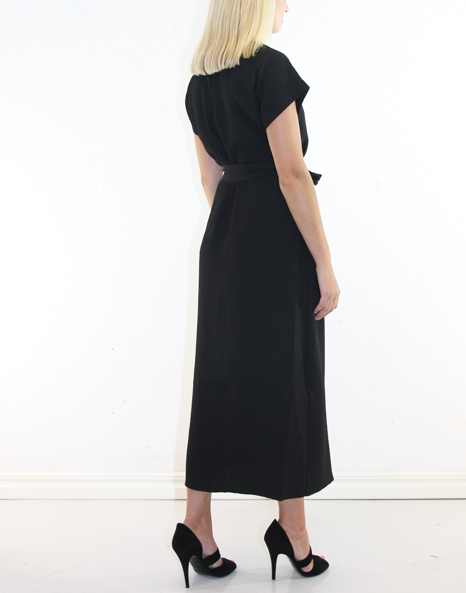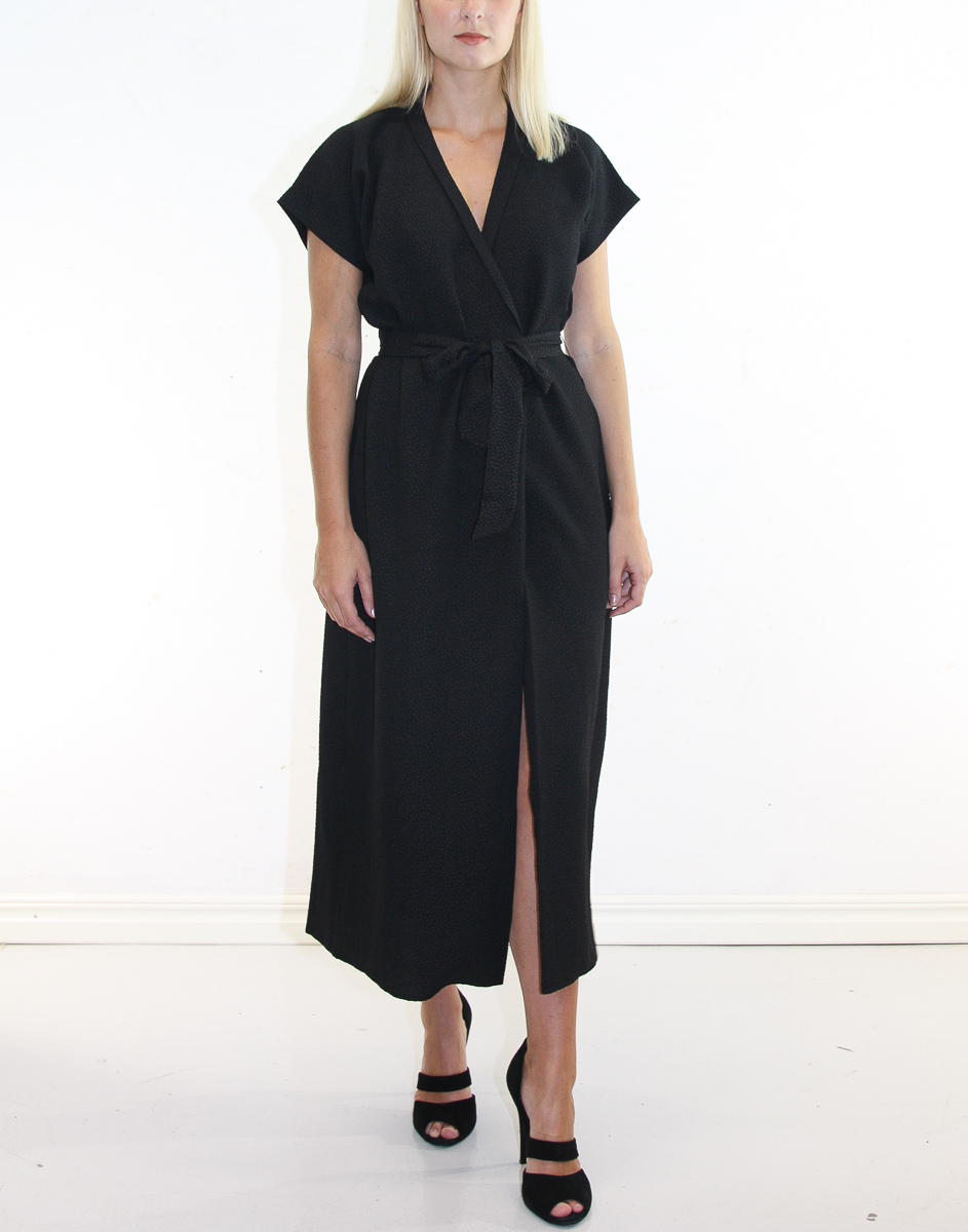 Denna långa wrap-klänning är skapad av ett texturerat jacquardtyg med en tonfärgskombination. Ett matchande tygbälte som knyts i midjan kompletterar denna korta ärm maxi-klänning.