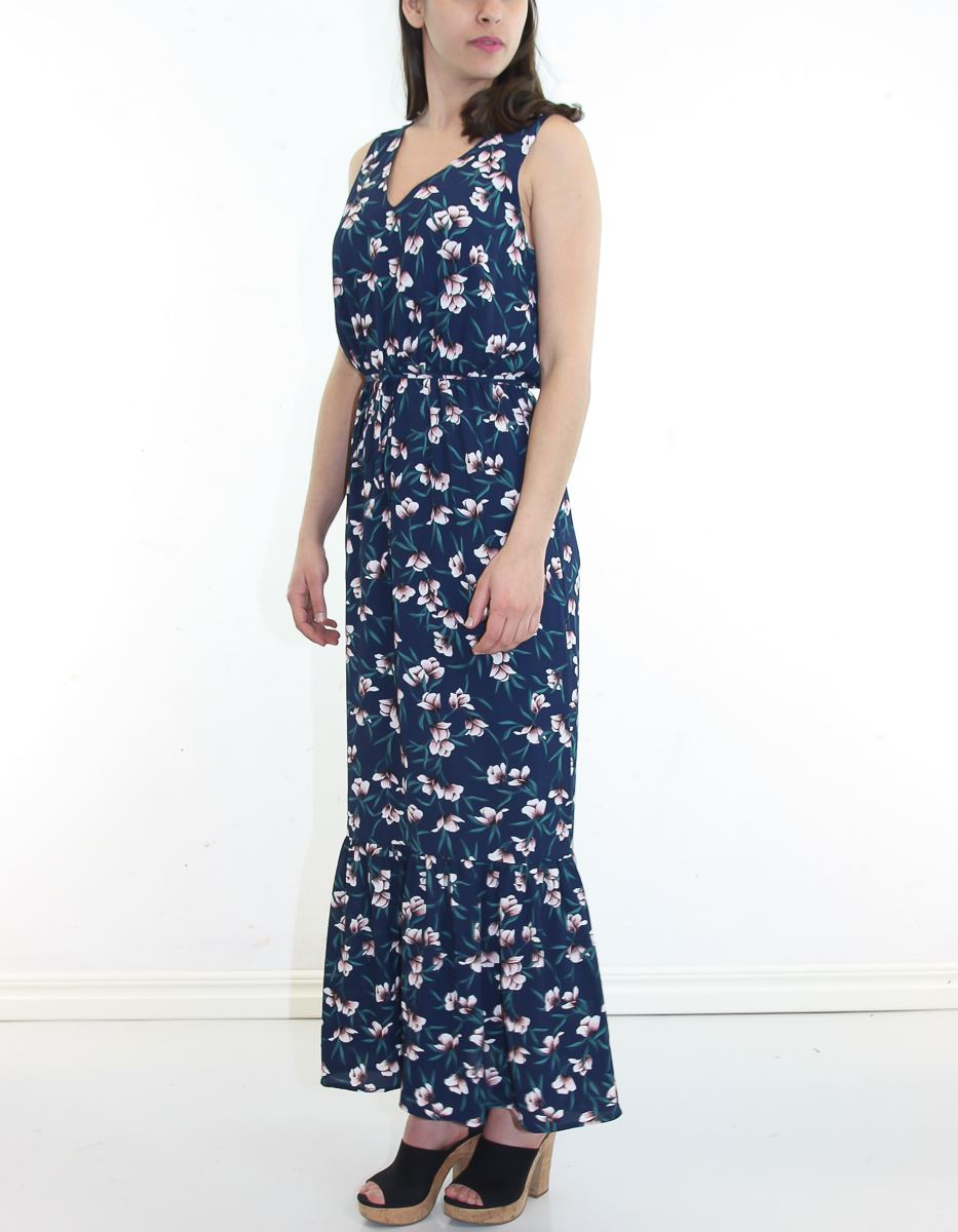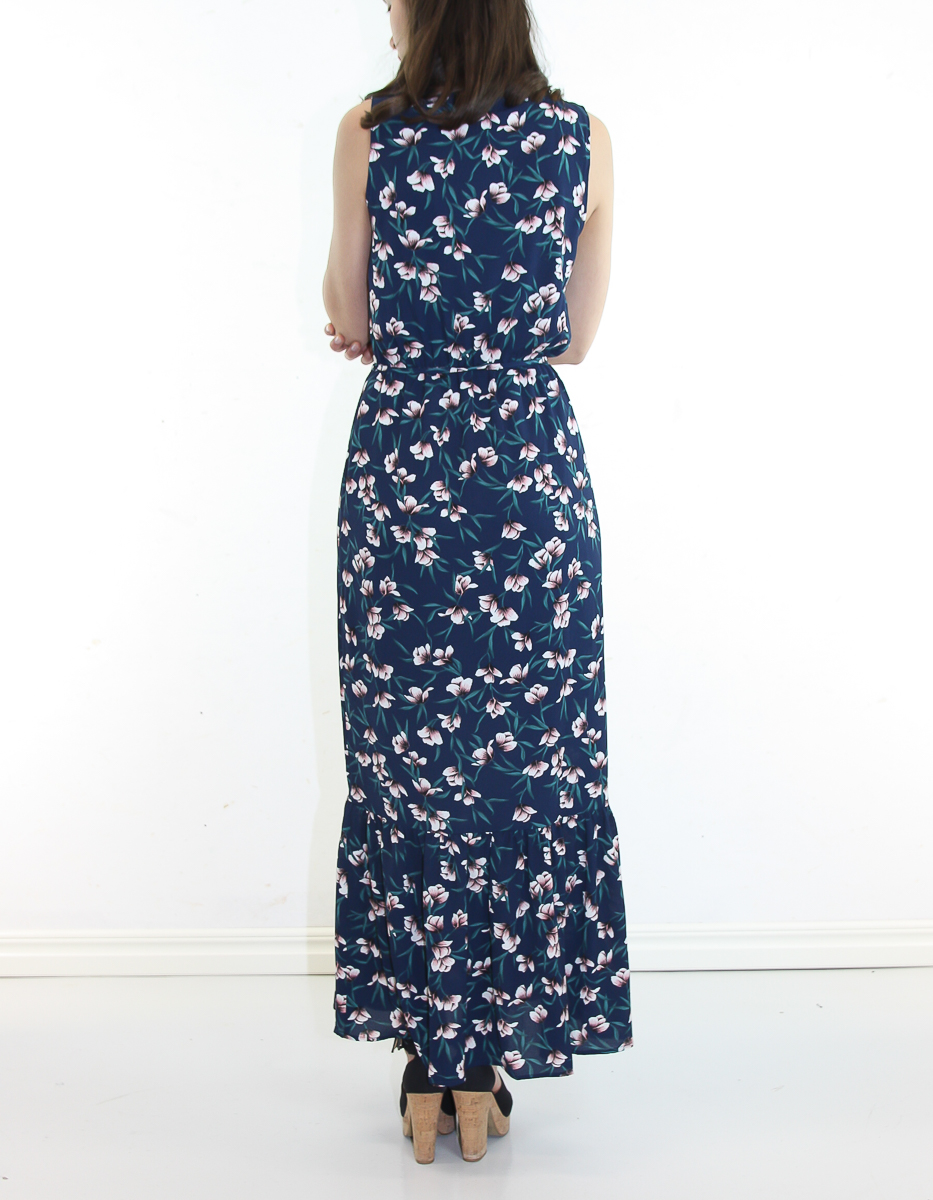Denna feminina klänning har en v-ringning fram, en volang längst ner och ett matchande bälte i midjan.