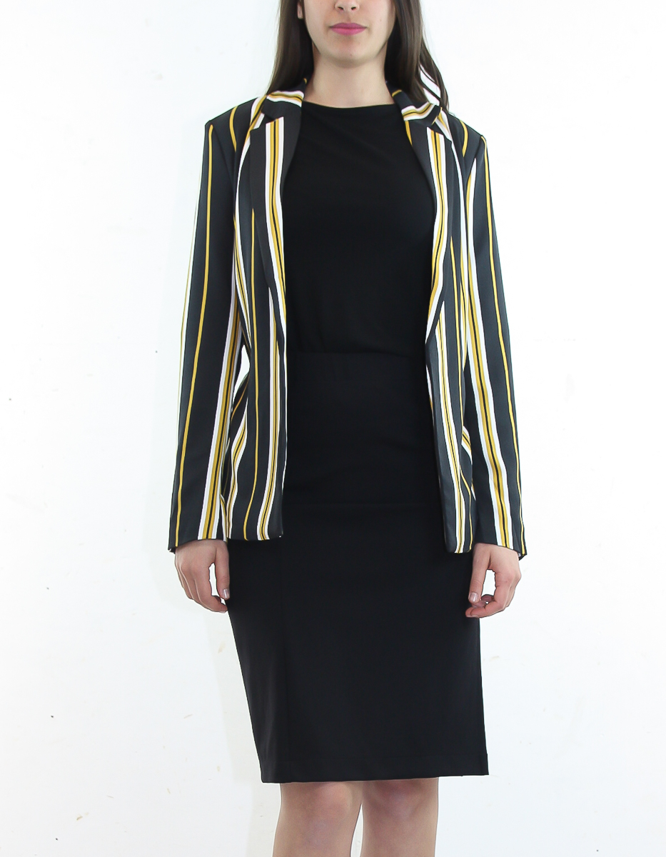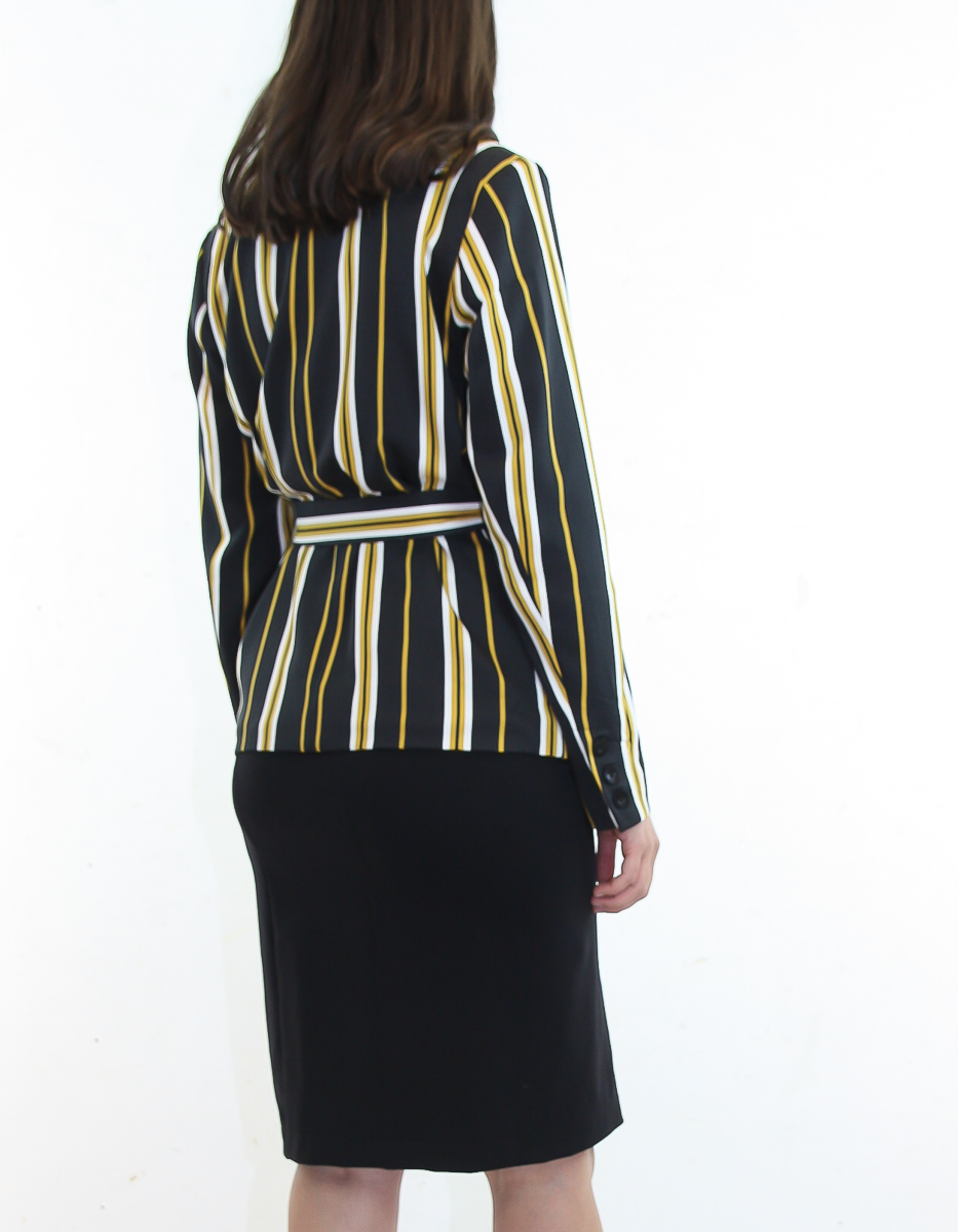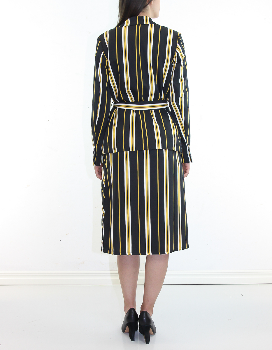 En fantastisk kavaj där tyget går i svart ton med gula ränder. Knyt den i midjan med tillhörande midjeband, eller ha den öppen. Den kan bäras tillsammans med den matchande kjolen för att få till hela looken.