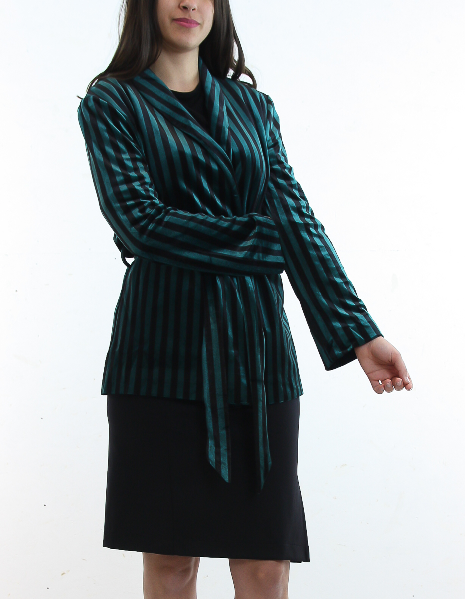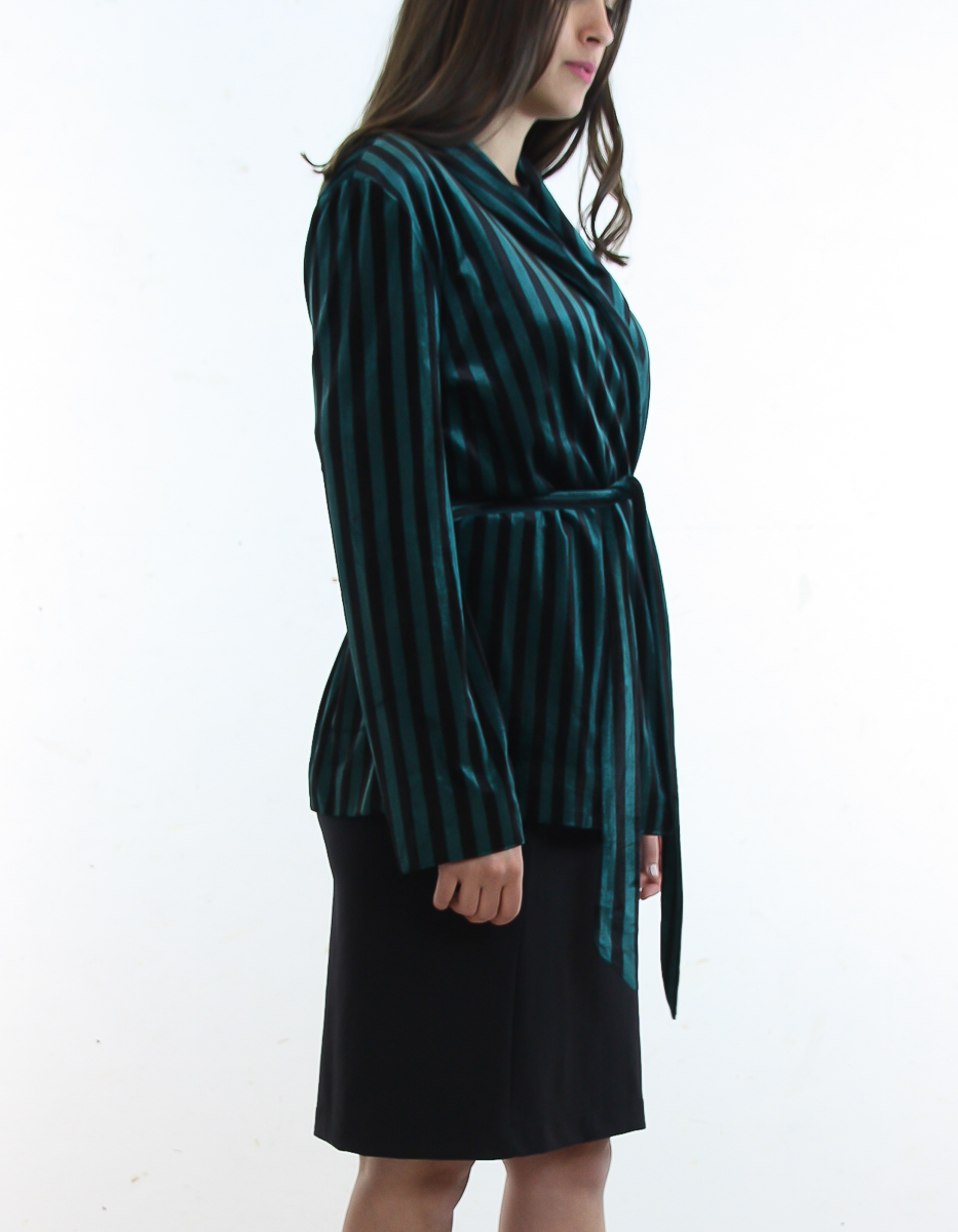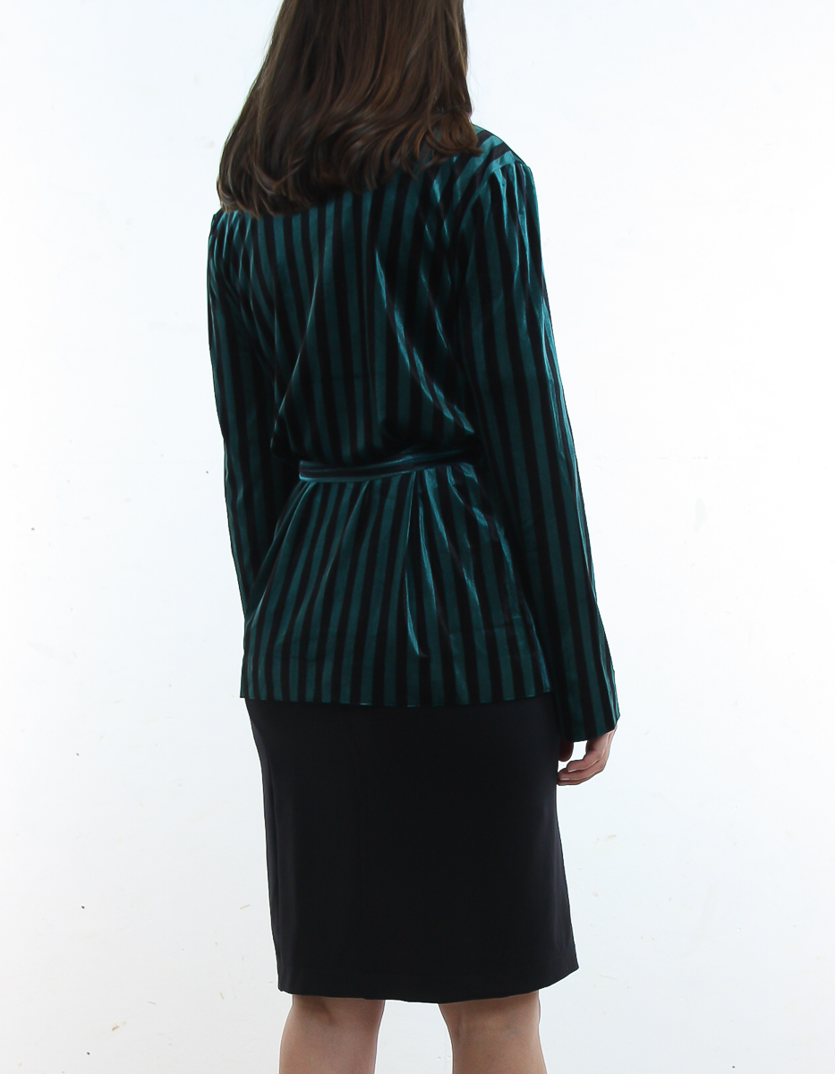 En kavaj i en mjuk och stretchig sammet med normal passform, detaljerade ränder och ett matchande bälte i midjan.