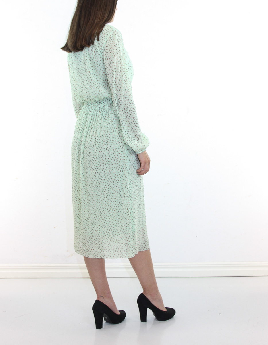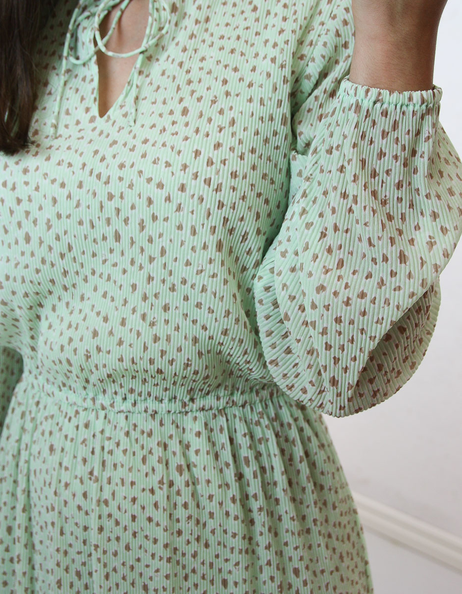 En sommarklänning med mintgrönt mini-plissétyg med beige fläckar. Bekväm passform och midilängd.