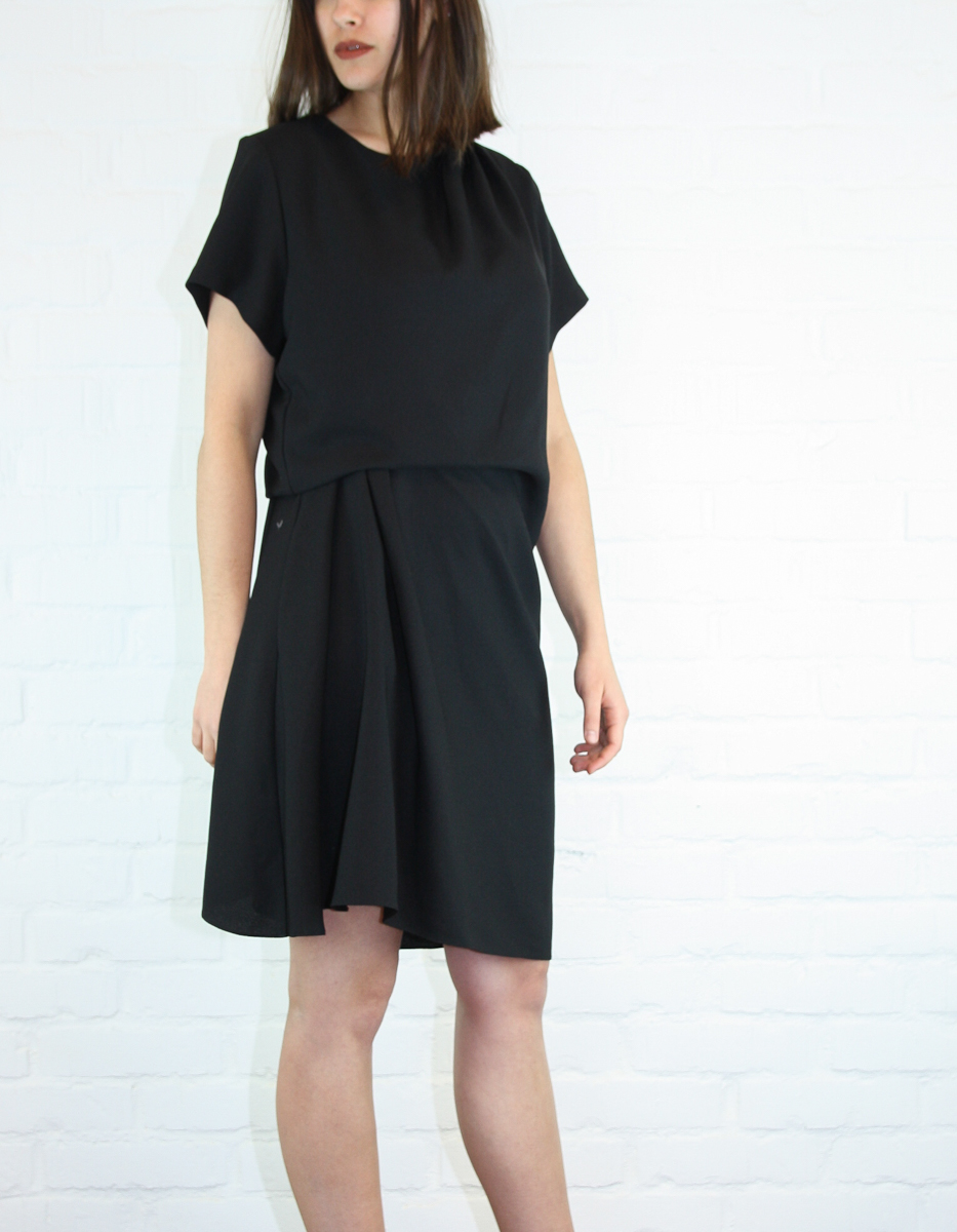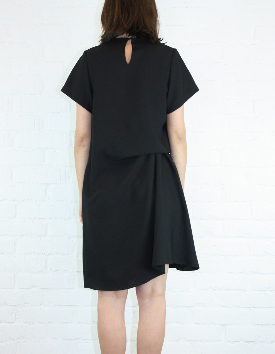 Den lilla svarta i annorlunda version; med en knut på höger höft som skapar ett draperat fall. Klänningen har kort ärm och nyckelhålsknäppning i nacken.