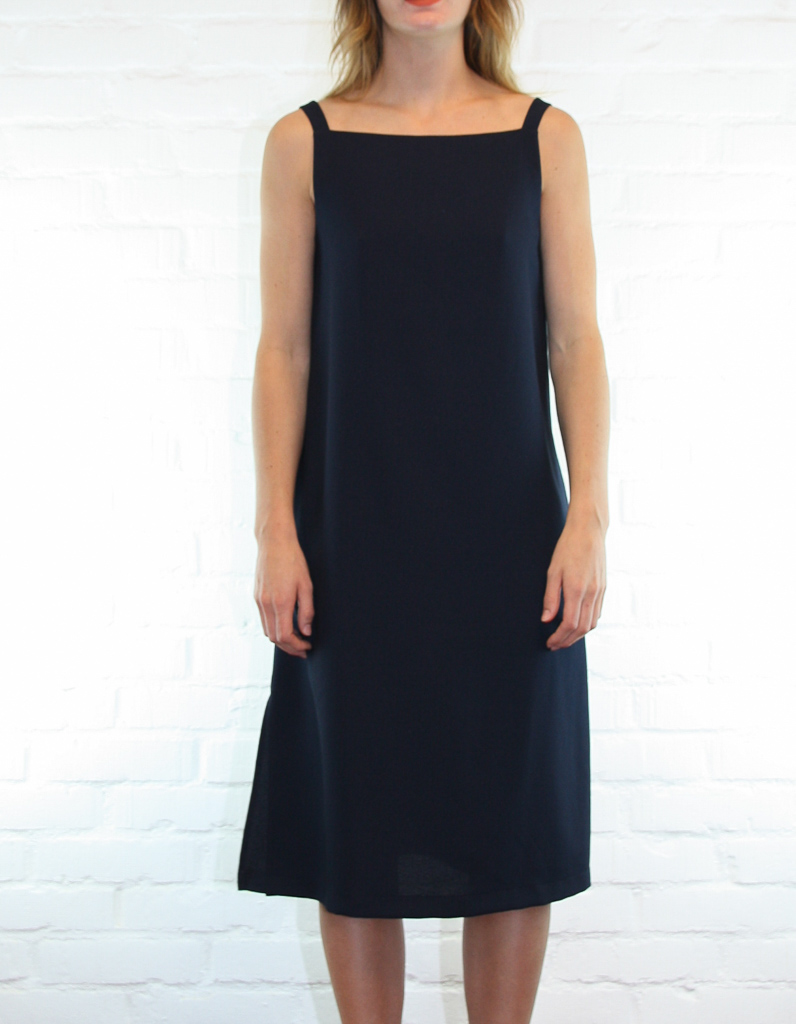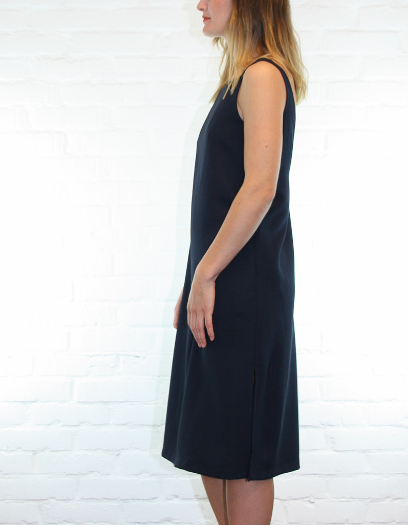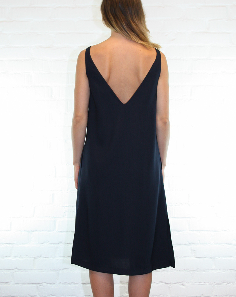 En enkel, men ack så vacker klänning. V-ringad rygg, relativt hög halsskärning samt slits på sidan.